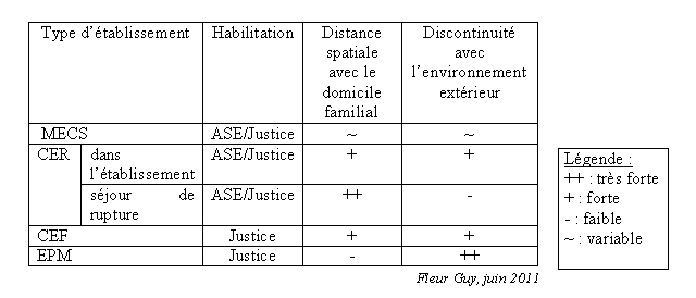 La question de la discontinuité entre les établissements et leur environnement se pose également dans le cas de structures dont la « fermeture » est au centre du projet. Issus de la loi Perben I (LOPJ), les CEF ont été perçus par les professionnels du domaine et certains chercheurs comme une entorse à la primauté de l’éducatif sur la sanction, principe fondateur de la juridiction spécialisée des mineurs instituée par l'ordonnance de 1945 (Goguel D’allondans, 2010 ; Mucchielli, 2005). Les CEF accueillent des jeunes en application d’un contrôle judiciaire, d’un sursis avec mise à l’épreuve, d’un placement extérieur dans le cadre d’un aménagement de peine ou à la suite d’une libération conditionnelle. Le CEF se caractérise par une « fermeture juridique » : « le non respect par le mineur des conditions du placement et des obligations fixées par la décision du magistrat pouvant entrainer sa détention » (DPJJ, 2010 : 10). Dans les faits, le CEF correspond souvent à la « dernière chance » avant l’incarcération et possède bien un caractère « fermé ». Pierre-Victor Tournier intègre ainsi les CEF à sa « mosaïque pénitentiaire ». Etablissant une « typologie des mesures et sanctions pénales », il note ainsi que « certaines personnes peuvent n’être pas sous écrou, tout en étant d’une certaine manière « enfermées » » (2006 : 8). La proximité des établissements avec le milieu familial et social est utilisée comme un argument pour justifier l'augmentation de ce type d'établissements : « Si l’on veut que les centres soient proches de l’environnement social du jeune, il en faut au moins un par département, ce que la loi va permettre » (Roché, 2002 : 44). Cette réflexion sur la localisation des établissements gagnerait certainement à s’accompagner d’un questionnement autour des possibilités même de contact avec l’extérieur pour les mineurs placés. En effet, l’impératif du maintien des liens familiaux reste inscrit dans le cahier des charges des établissements mais doit s’articuler à la nécessaire « rupture avec leur environnement « pathogène » et maltraitant » et la mise en place « des cadres et modes de prise en charge des jeunes plus contraignants et plus contenants » (Darnaud, 2010 : 62).