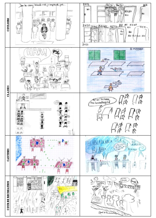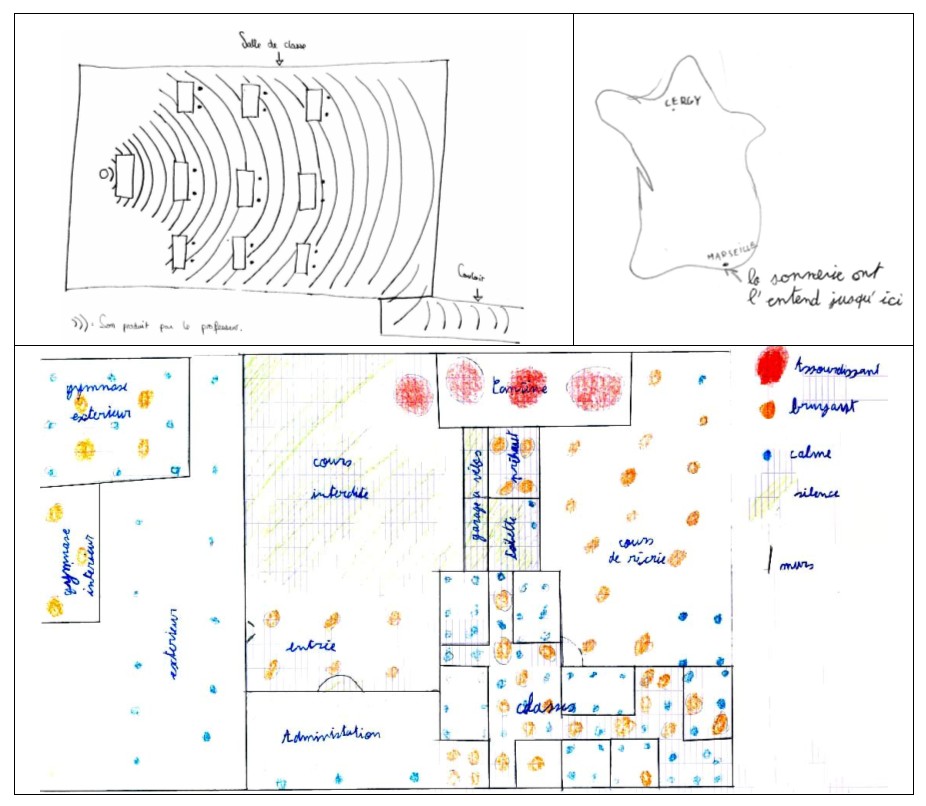 Le travail d'analyse a consisté à s'appuyer sur le sens (signification) que les enfants donnent aux sons qui les entourent (à partir de leurs productions verbales ou graphiques) pour en déduire la structure et les propriétés des représentations des ambiances sonores, représentations individuelles et collectives, plus ou moins largement partagées (Dubois, 2000). Cette étape permet de comprendre les différentes stratégies d'évaluation de la qualité acoustique des espaces intérieurs et extérieurs des établissements, en fonction des populations et ainsi enrichir la connaissance sur les sons du quotidien, encore mal connus dans les pratiques "d'habiter les espaces" (Chelkoff et al., 1987).