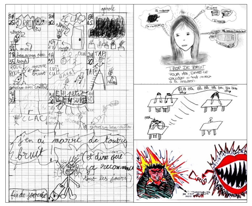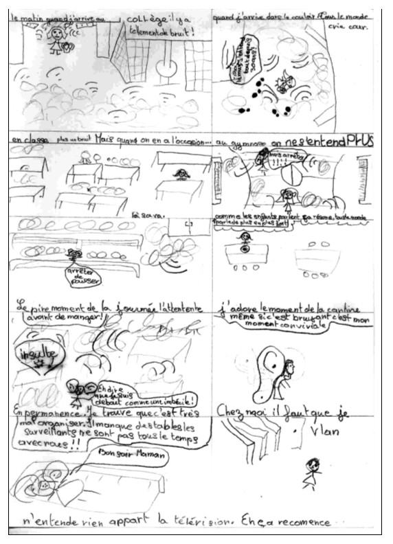 Les représentations de type SITUATIONS sonores regroupent les dessins qui décrivent un lieu (salle de classe, Centre de Documentation de d’Information, cour de récréation : Figure 7), une activité à travers des sources sonores identifiées à un moment donné (par exemple, indication de l'heure). Ces situations sonores du collège sont présentées soit de manière individuelle (différents dessins séparés), soit sous forme de bandes dessinées (Figure 8) avec une notion temporelle supplémentaire : le déroulement dans le temps et le sentiment de durée. Les occurrences des principaux lieux cités sont présentées dans la Figure 6.