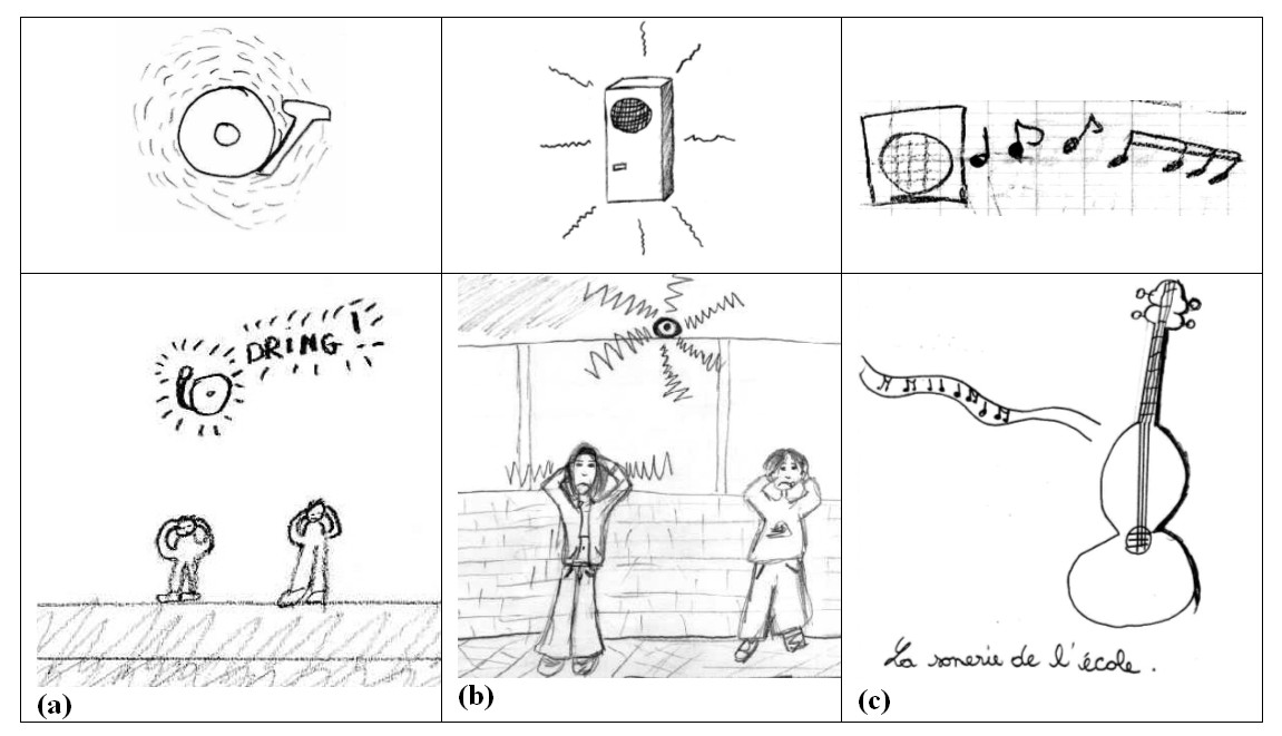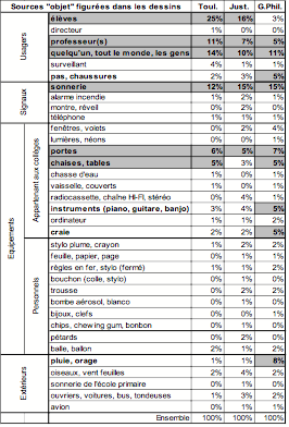 Nous pourrons observer par exemple le caractère sémantique du bruit c'est à dire quelles sont les catégories d’objets qui sont dessinées par les enfants (montre, stylo, craie etc.). Certains objets, comme les sonneries des collèges, ont mérité une enquête plus poussée.