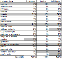 Il est à noter ici que le collège Gérard Philippe qui est le plus récent, est aussi celui qui a une meilleure isolation acoustique entre les salles de cours (Lavandier et al., 2004). C'est dans ce collège que les enfants entendent le bruit des craies sur le tableau et qu'ils entendent le bruit de la pluie sur les carreaux. Une meilleure isolation acoustique permet de détecter des sons de faible intensité, ce qui n'est pas forcément gage de qualité lorsque ces sons ne sont pas appréciés.