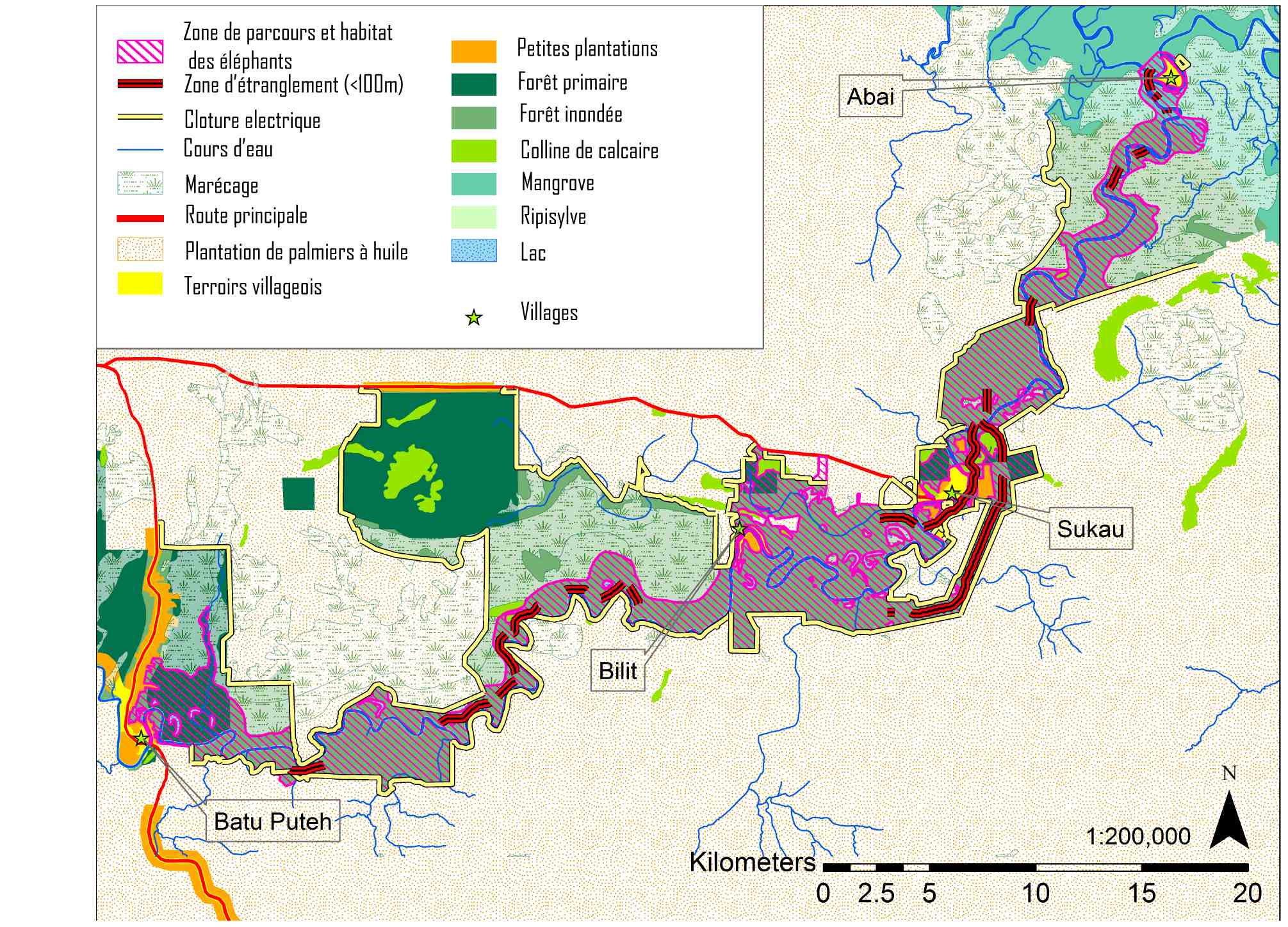 Parallèlement, l’augmentation de la conversion des forêts non protégées en plantations de palmiers à huile (Bissonnette, 2011 :142) force les bêtes à se réfugier dans le sanctuaire (Ancrenaz & Al., 2005 ; SWD, 2011). La densité y augmente donc régulièrement : les éléphants sont passés de 100 à 300 individus au cours des années 2000 (Estes et Al., 2012), les orangs-outans sont environ 1100 dans le sanctuaire (Ancrenaz & Al., 2005). Par conséquent, la fréquentation des terroirs villageois par la faune est de plus en plus fréquente. Or, les déplacements des animaux hors du sanctuaire les rendent vulnérables : ils menacent les cultures et suscitent des conflits avec les habitants et les planteurs (SWD, 2011). De plus, les pièges tendus pour le gibier blessent sans distinction, que l’espèce soit protégée par la loi ou non (Sabah State, 1997). 20% des 300 éléphants du sanctuaire ont des blessures (SWD, 2011 :6). Les ONG et le Sabah Wildlife Department invoquent ces faits pour promouvoir la création d’un couloir végétal continu qui engloberait les villages en élargissant les voies de contournement (Ancrenaz & Al., 2005 ; SWD, 2011). Le projet du fonds mondial pour la nature fait environ 120 kilomètres d’est en ouest et 10 à 20 kilomètres de large (WWF, 2001) (figure 2). Or, même si ce projet se concrétise, les terroirs villageois seront toujours ouverts à la faune.