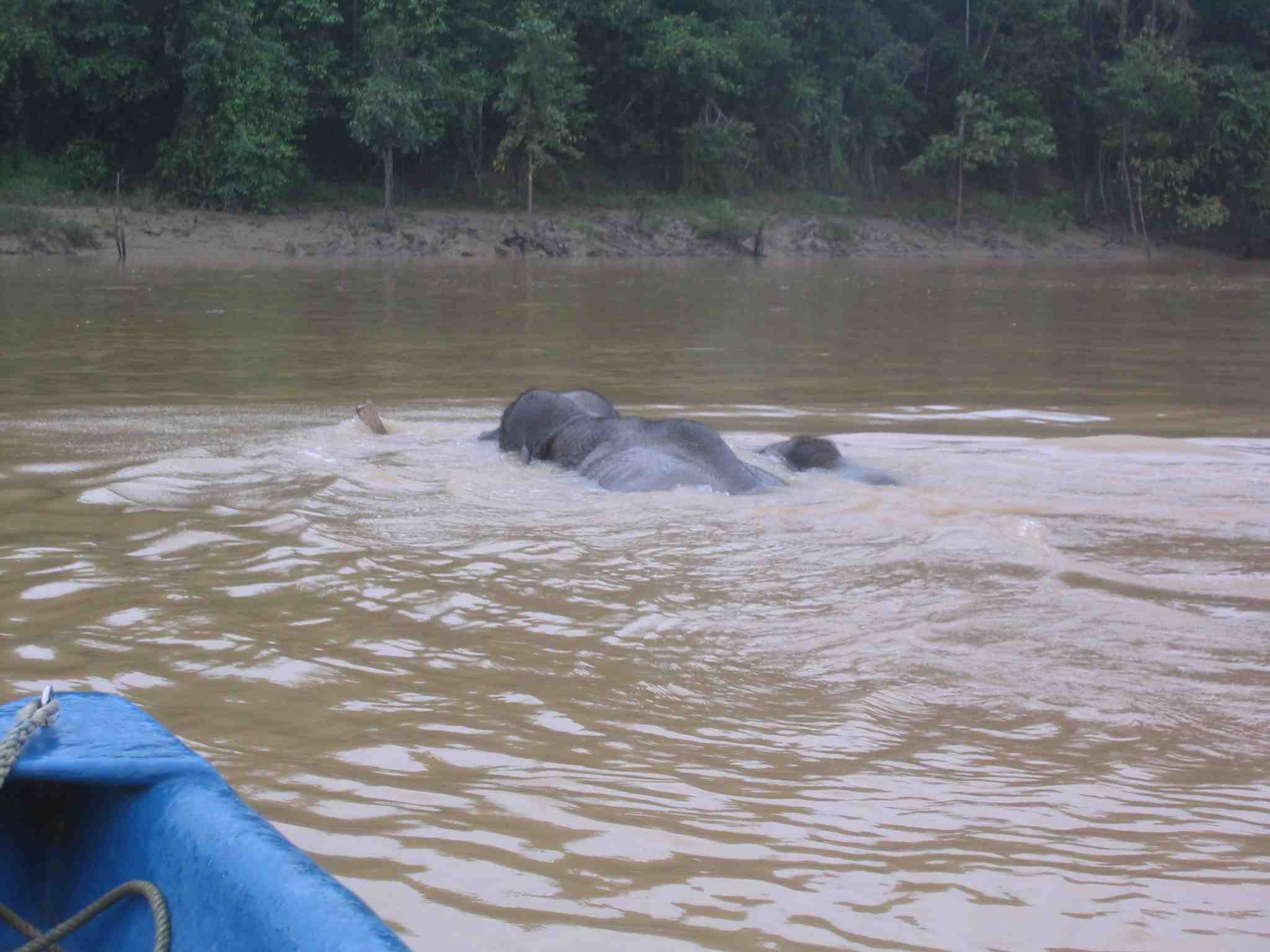 Figure 5 : Démonstration de l’intelligence pratique d’une éléphante nageant en aval de son petit. (Photo de l’auteur : Septembre 2006)