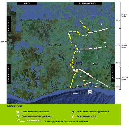 Figure 1 : La localisation de la zone étudiée en Côte d’Ivoire et les principaux domaines climatiques associés