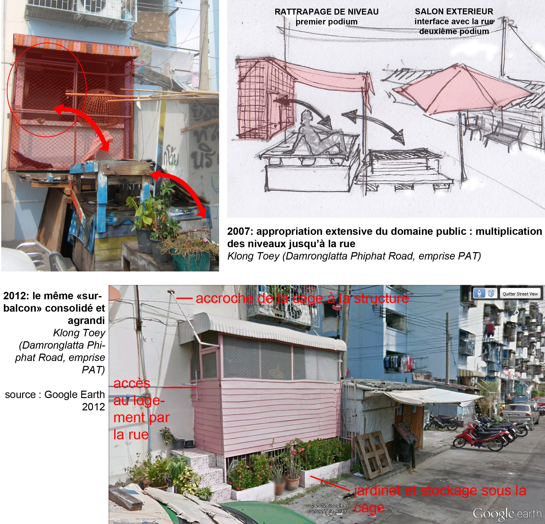 La croissance des bidonvilles interroge les modalités de production de la ville, notamment dans les pays en développement. Ce phénomène global demeure majoritairement prégnant dans les métropoles des pays émergents et en développement, où il pose des problèmes sanitaires, environnementaux et urbains notamment (Davis, 2006). C'est ainsi un défi majeur de développement qui illustre les inégalités et une certaine non-maîtrise de la croissance urbaine. À Bangkok, outre la flexibilité de leur architecture, de tels ensembles cristallisent souvent des pratiques sociales et une histoire commune propres au lieu. Bien que rarement pris en compte dans la métropole et victimes d'une image négative, ils font preuve d'un dynamisme économique et associatif stimulant et représentent un enjeu fort face aux notions de développement durable et de droit à la ville, à l'échelle locale comme internationale. Généralement qualifiés de « communautés denses » ou « slum communities », nous avons privilégié ici le terme « habitat spontané » parce que directement lié à la question spatiale et au processus constructif qui le caractérise.