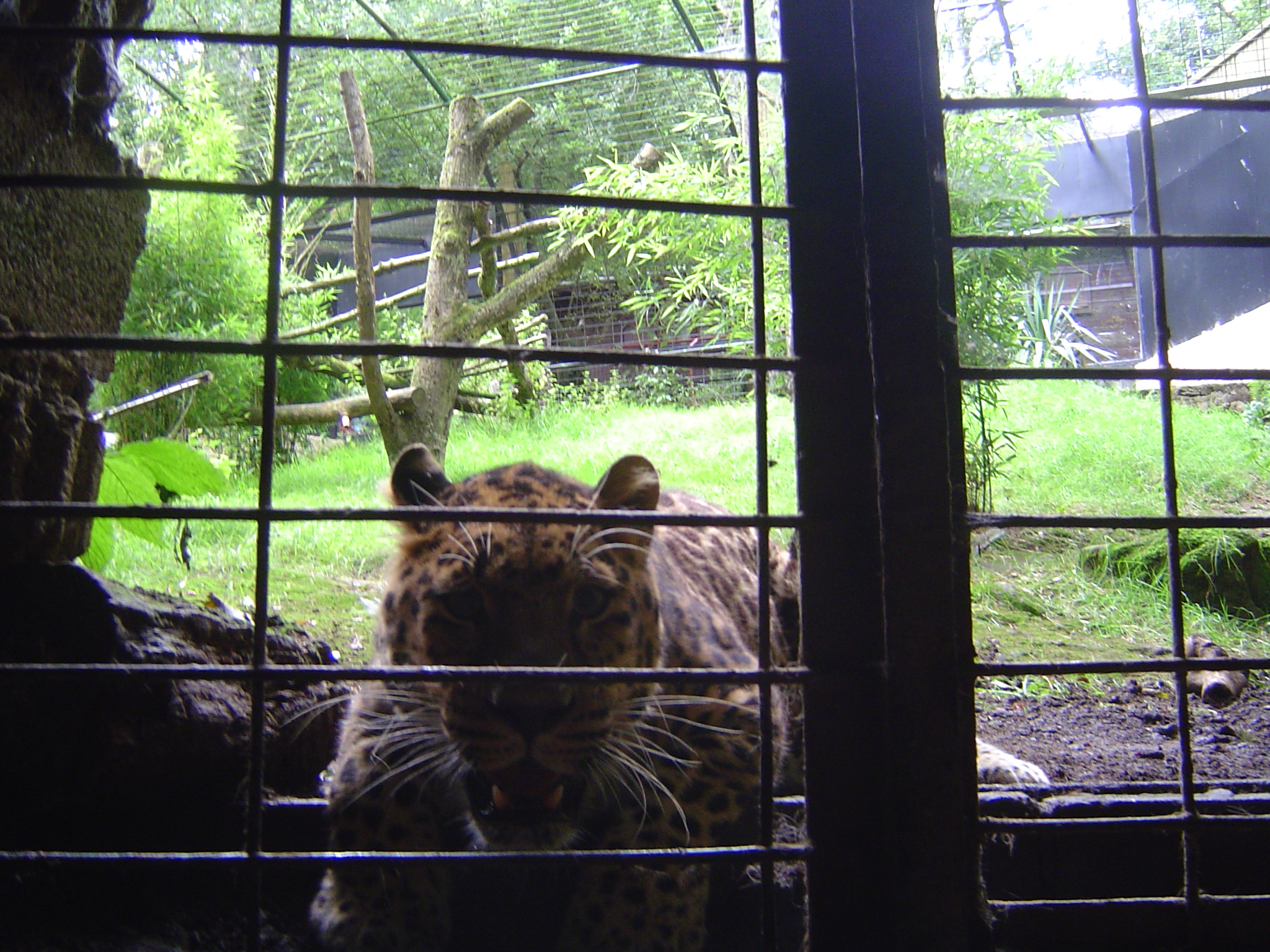 Nous entendant arriver, la panthĂšre vient immĂ©diatement sâinstaller devant la trappe par laquelle elle pourra entrer quelques instants plus tard. Elle rugit en nous regardant, puis passe une patte Ă lâintĂ©rieur du rĂ©duit, agrippe la palette en bois qui lui sert de couchage, la soulĂšve et la fracasse contre la grille.