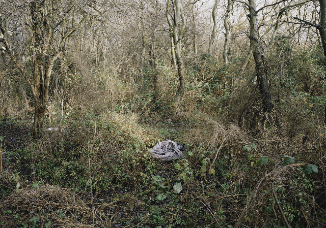 Sur une thématique similaire, le travail de Mathieu Pernot a fait l’objet de plusieurs expositions dernièrement (www.mathieupernot.com). Parmi elles, La Traversée présentée au Jeu de Paume du 11 février au 30 mai 2014, a été l’occasion de mettre en évidence le fil rouge de la démarche de l’artiste : s’inspirant de l’Histoire, utilisant régulièrement l’archive comme source d’inspiration, il produit des récits en s’attachant à détourner les codes de la photographie documentaire. La sélection proposée pour La Traversée se présente comme « la mise en forme d’une histoire contemporaine incarnée par des personnages vivant à sa marge». A ce titre, plusieurs séries rendent hommage à la communauté tsigane. Son intérêt pour le sujet est né de la rencontre avec une famille de gens du voyage photographiée durant plusieurs années à Arles – où le photographe a été étudiant. Outre les séries portant sur la condition des tsiganes, il a également exposé un travail sur la situation des migrants d’origine afghane en France. En 2009, il a photographié les corps assoupis des Afghans au lever du jour dans le square Villemin pour la série Les Migrants. Aucun visage n’apparaît, ni aucune partie des corps entièrement recouverts par des draps, couvertures ou sacs de couchage. Pour le livre Les migrants, Mathieu Pernot a associé cette série à celle intitulée La Jungle réalisée à Calais en 2009-2010 (Pernot, 2012). Les images représentent la forêt portant les stigmates d’une occupation récente.