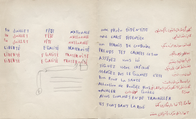 Les photographies de nature investie et de corps ensevelis sont accompagnées de reproductions d’un journal de bord d’un jeune Afghan confié au photographe et d’extraits d’un cahier de cours de français. A travers la liste de mots et des phrases dictées, la condition de vie de ces refugiés apparaît en filigrane :