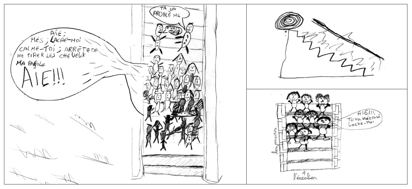 Au travers de la figuration des lieux du collège, toutes les descriptions et appréciations des éléments constructifs du bâtiment nous intéressent plus particulièrement. Encore une fois dans cet article, tous les lieux ne seront pas analysés, mais quelques exemples seront présentés. Nous avons analysé les représentations des escaliers des trois collèges (illustrés Figure 10). Si relativement peu d’élèves ont évoqués ces lieux (3%), les dessins représentant des escaliers se distinguent par la relation entre la géométrie de l’espace et l’usage (circulation) qui en est fait. Alors que dans les couloirs (autres lieux de circulation) les élèves évoquent surtout la sonnerie, les voix et la réverbération, les actions situées dans les escaliers relatent des événements sonores agressifs (chute, écrasement), du fait des mouvements de compression que son usage occasionne. Les escaliers sont des espaces étroits, en pente et même parfois glissants, difficilement surveillés, où les élèves sont le plus souvent pressés, ayant que peu de temps pour changer de cours ou se précipitant à l’extérieur pour la récréation.