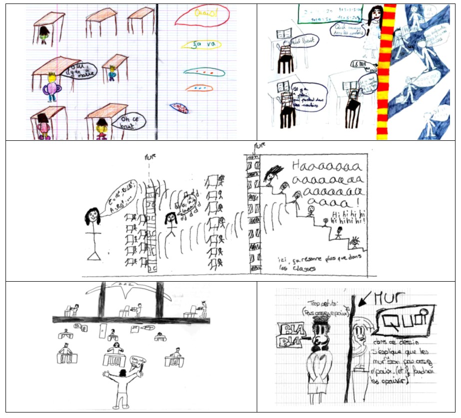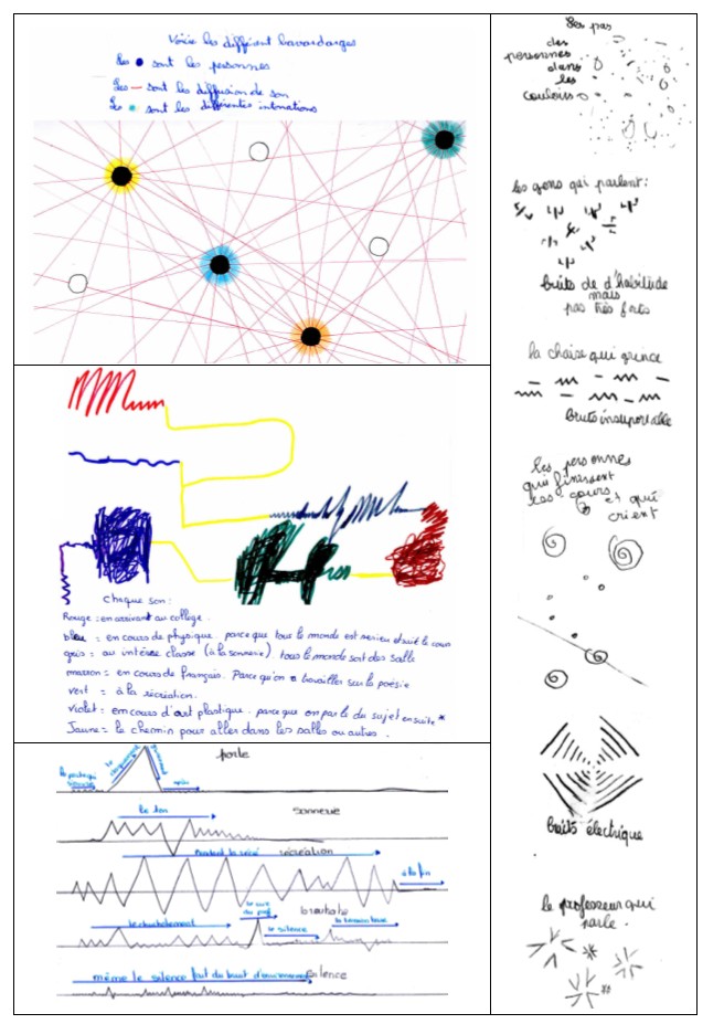 Les CARTOGRAPHIES sonores (Figure 12) sont peu représentées dans l'ensemble des productions graphiques des enfants (seulement 4% de l'ensemble des dessins dans les trois collèges confondus). Elles se présentent sous forme de plans à différentes échelles (de la classe à la France, en passant par le collège). On remarque que la propagation sonore est bien illustrée par la représentation des ondes produites par le professeur. On retrouve aussi la transparence acoustique des parois entre la salle de classe et le couloir (dessin en haut à gauche). La transparence acoustique se trouve abordée de façon humoristique ici lorsque la sonnerie se propage jusqu'à Marseille. On trouve aussi la notion d'échelle des intensités sonores.