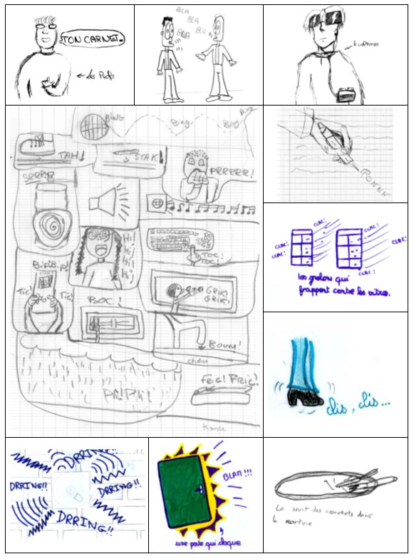 Les sources sonores sont décrites en tant qu'OBJETS dont les caractéristiques sonores sont exprimées soit avec des commentaires sous forme d'onomatopées, soit avec un graphisme de la vibration sonore, soit les deux. Le mode graphique associé aux objets semble traduire une possible nuance d'appréciation : l'identification (dessin sans commentaire), la caractérisation (dessin avec onomatopées), l'intensité de la perception sonore (tracé des vibrations ou ondes sonores). Quelques exemples de dessins sont présentés Figure 2.