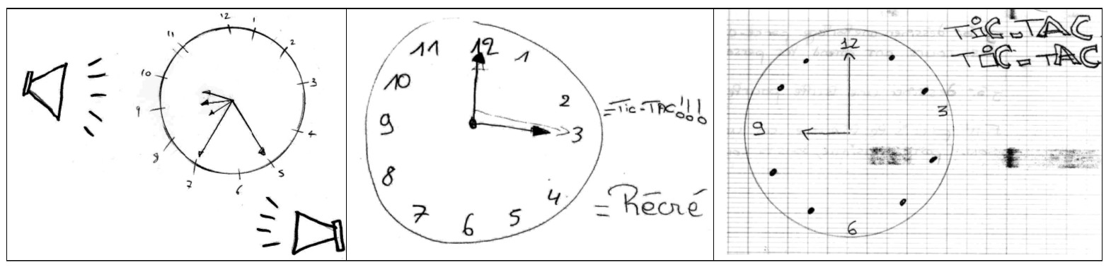 Lorsque des situations sont représentées, nous pourrons alors nous intéresser aux usages, c'est à dire aux activités qui ont lieu dans l'espace et dans le temps. Il est ici particulièrement intéressant d’observer les modes de représentation du temps, élément régulateur du fonctionnement "technico-social" des établissements d’enseignement (Ignazi et al., 1993). Les élèves relatent-ils un moment, une heure ou une période dans leur dessin, comment l’ont-ils indiqué et y ont-ils associé un jugement ? L’analyse des modes graphiques symbolisant une temporalité, suggérée ou indiquée, est un indice de l’appréciation temporelle des phénomènes sonores, comme l’impact de la répétitivité et de la durée par exemple.