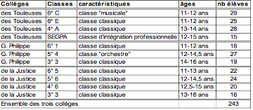 Quatre classes au collège des Touleuses ont été rencontrées, grâce à la participation de trois enseignants de Section d’Enseignement Général et Professionnel Adapté (SEGPA), de français et d'histoire géographie: deux classes classiques de 6ème et 4ème, une classe musicale pratiquant 1 heure d’éducation musicale au collège (comme toutes les classes) plus 4 heures de musique au conservatoire par semaine ainsi que des élèves de SEGPA (classe d'intégration professionnelle). Les enquêtes se sont déroulées pendant l'heure de cours ou l'heure de vie de classe pour les élèves de 6ème uniquement. Trois classes du collège Gérard Philippe avec le concours de professeurs de dessin, de français et de musique ont été interrogées : deux classes d’enseignement "classique" et la "classe orchestre" du collège (2 heures de répétitions supplémentaires par semaine). De même, quatre classes d’enseignement "classique" ont été questionnées au collège de La Justice grâce à la participation d’une enseignante d’éducation musicale.