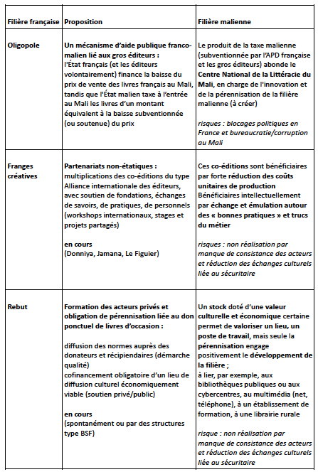 Dans les trois registres de proposition, nous observons que des actions significatives ont déjà été engagées dans les franges créatives et le rebut par les acteurs eux-mêmes et sans aide publique significative. Ces astucieuses coopérations d’acteurs à faibles ressources financières peuvent être amplifiées sans les limiter au registre de la librairie formelle ou de la francophonie officielle. C’est l’innovation mutuelle et non la diffusion d'un modèle français stéréotypé difficilement généralisable qui importe. Concernant le cœur de cet échange inégal, les baisses de prix déjà ponctuellement travaillées entre grands éditeurs et État français ne convainquent pas, car c’est bien de la protection du marché malien dont il s’agit et non simplement de l’accès à des livres moins chers. Une partie significative de l’élite française étant attachée à l’exception culturelle et à la protection de ses propres outils culturels, de nombreux acteurs français sont en mesure d’admettre que toute exportation de livres français au Mali puisse financer un outil d’aide publique malien au livre (en fait à la littéracie) comparable au CNL français – sans limiter aucunement l’accès du public malien au livre français et notamment aux genres que l’édition malienne ne sera pas en mesure de produire avant un certain temps ou peut-être jamais, compte-tenu de l'effet de taille. En prenant en compte le chiffre difficilement vérifiable de 250 000 livres français entrant au Mali annuellement, on voit qu’une baisse de 4 € par livre (partagée à 50 % entre l'État français et les grands éditeurs concernés) permettrait à une taxe partenariale de dégager une somme théorique d’un million d’euros pour abonder un CNL malien .
