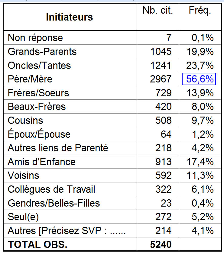 Ainsi, parmi les 5 240 répondants du département de la Somme (Picardie), à savoir 1/5ème des effectifs d’une région connue pour sa cynégéphilie, l’intronisation dans ce rôle passe essentiellement par les ascendants directs et indirects, voire par l’environnement amical et professionnel ou le voisinage. De la sorte, ils ne sont que 5% à déclarer s’être auto-initiés, sachant que leur première expérience s’est réalisée en moyenne aux alentours de leur dixième année, et ce comme accompagnateur.