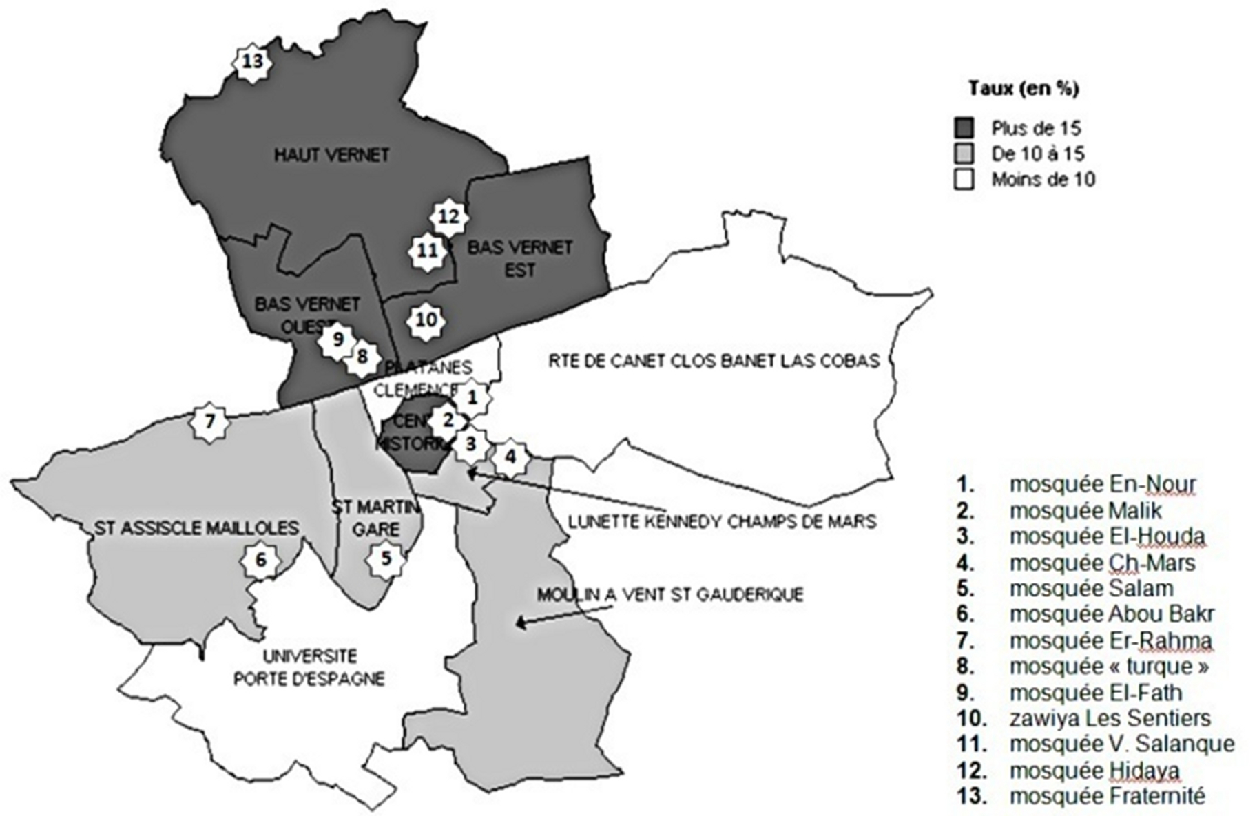 Signalons également que trois lieux de culte se trouvent à l’extérieur de quartiers populaires de la ville : la Grande Mosquée de la Fraternité [13] dans le sillage de la Fédération nationale de la Grande Mosquée de Paris (proche de l’Algérie), la Mosquée Er-Rahma [7] de la jama‘at at-tabligh et la zawiya [10] de la tariqa naqshabandiyya. Avec le local de l’association El Houda [3], ce sont les lieux de culte les plus récents. Les dix autres mosquées de la ville se situent donc toutes à l’intérieur de quartiers populaires dont sept au sein de cités à logements sociaux. Aussi faut-il faire remarquer que :