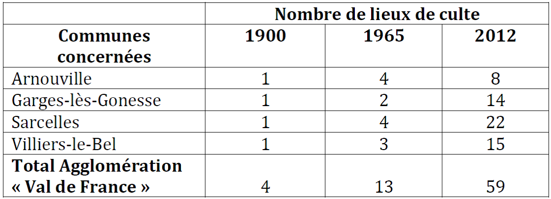 Selon le recensement effectué en 2012 à Sarcelles, Villiers-le-Bel, Arnouville et Garges-lès-Gonesse, le nombre de lieux de culte a décuplé dans le périmètre de l’agglomération en une centaine d’années, et quadruplé en quarante ans : on est passé ainsi de 4 lieux de culte en 1900 (une église catholique dans chaque commune) à 13 lieux de culte en 1965 et à 59 en mai 2012 (70 en incluant les églises évangéliques non affiliées, les lieux de culte en construction et ceux dont le permis de construire a été déposé).