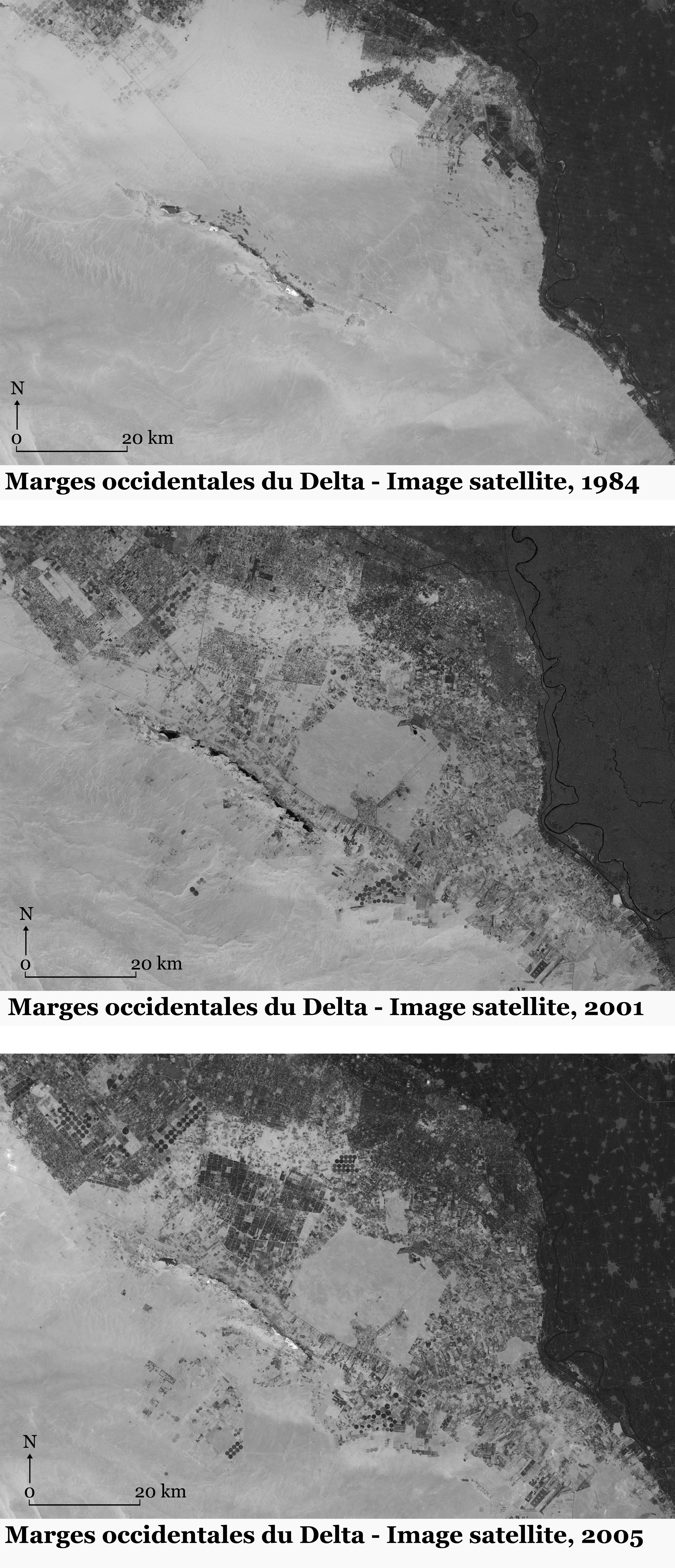 Si différentes régions ont été sélectionnées en vue des projets d'extension des terres, ce sont d'abord les marges désertiques les plus proches du Delta qui sont mises en valeur, donnant naissance à des territoires nouveaux, dont l'étendue augmente au fur et à mesure des dynamiques de mise en culture, qui viennent ainsi repousser sans cesse la frontière entre Delta et désert (Fig. 3). La conquête progressive de ces nouvelles terres requiert ainsi de faire la distinction entre les « vieilles » nouvelles terres, qui ont été mises en valeur au cours des années 1950-60 et tendent à se confondre dans les paysages et les systèmes de production avec les terres du Delta, et les « nouvelles » nouvelles terres, qui ont connu une forte expansion depuis le tournant des années 1990. En découle l'idée d'un entre-deux non homogène, dont les relations avec les espaces qui l'encadrent et les caractéristiques internes varient selon la période de conquête et la nature des acteurs impliqués.
