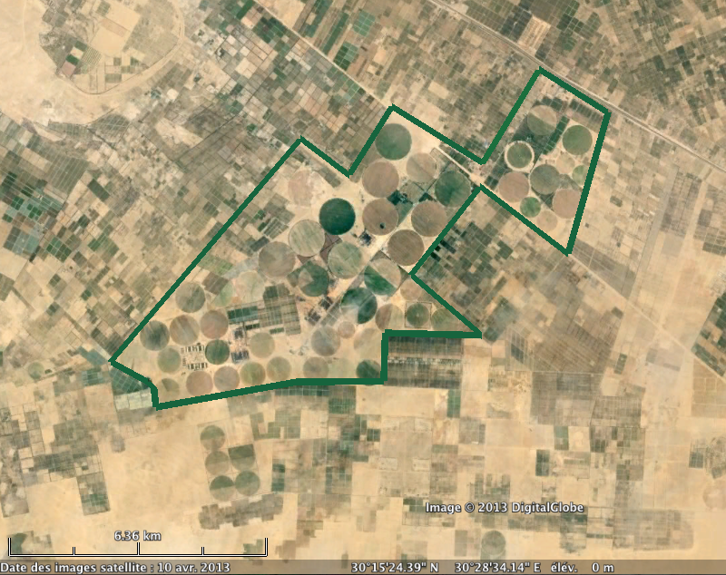 Cette exploitation de plus de 6000 ha (limites en vert), située sur la route d'Alexandrie à 80 km du Caire, est la plus vaste de la partie ouest du Delta. Elle associe cultures annuelles sur des parcelles irriguées par pivots et cultures permanentes irriguées au goutte-à-goutte (vergers).