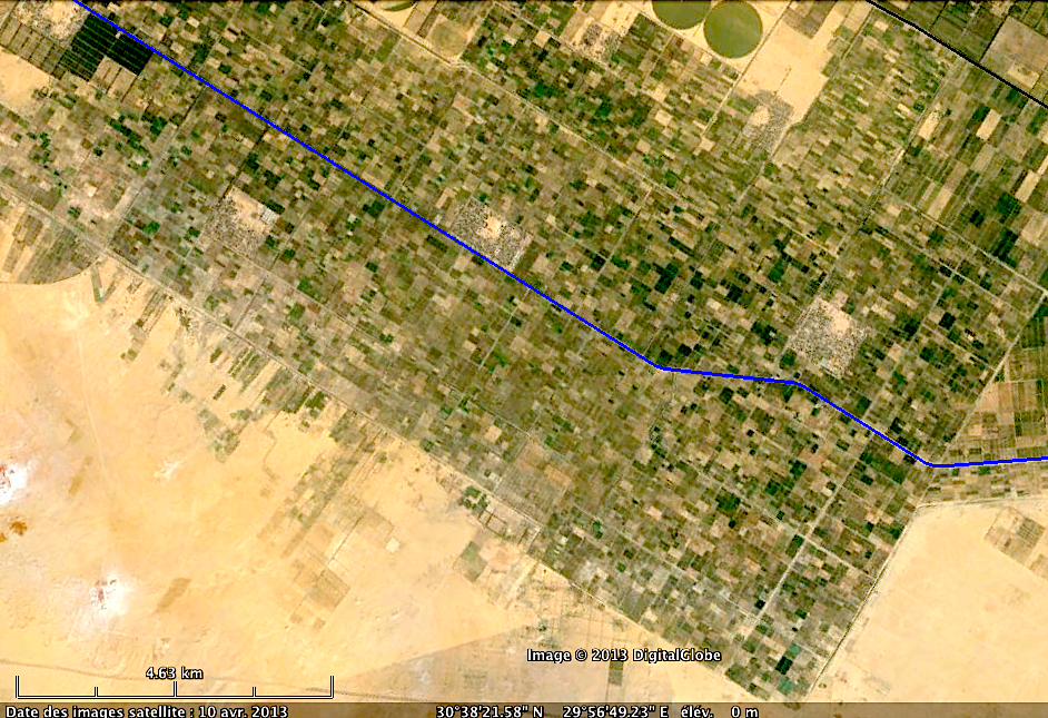 Le canal principal (en bleu sur l'image) permet d'irriguer les parcelles de 2,5 à 5 feddan situées de part et d'autre et disposées autour des villages-centres.