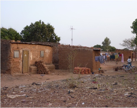 Figure 1 : Maisons en banco d'une zone non-lotie. L'antenne de télévision témoigne d'un accès à l'électricité via des raccordements illégaux au réseau électrique de la zone lotie voisine.