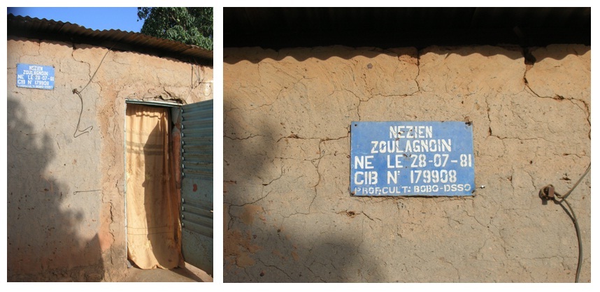 Devant la difficulté financière et logistique qu’a parfois la ville à créer des lotissements, certaines zones non-loties ont plus de vingt ans. Mais leur l’ancienneté n’enlève en rien le caractère temporaire qu’elles ont dans le processus d’urbanisation. En effet, la création de logements « légaux » par du lotissement se fait soit sur des champs, soit sur des zones d’habitat spontané où les maisons sont alors détruites. Lors d’opérations de lotissements, la mairie établit une liste d’attributaires pour les parcelles loties en fonction de critères prédéfinis. Des agents municipaux effectuent le recensement des familles qui résident dans les zones non-loties. Si un logement est inhabité, il n’apparaît pas dans le recensement. Pour éviter de manquer la venue des agents en cas d’absence et de perdre ainsi la chance d’être recensées, des familles affichent un panneau sur leur maison indiquant le nom, la date de naissance, le numéro d’identité et parfois le numéro de téléphone du chef de famille (figure 4 ci-dessous). Le recensement concerne aussi les agriculteurs propriétaires coutumiers des terres à lotir.