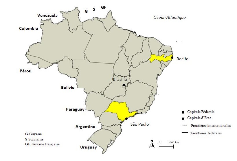 Figure 1 : localisation des Etats de São Paulo et du Pernambouc (São Paulo & Recife).