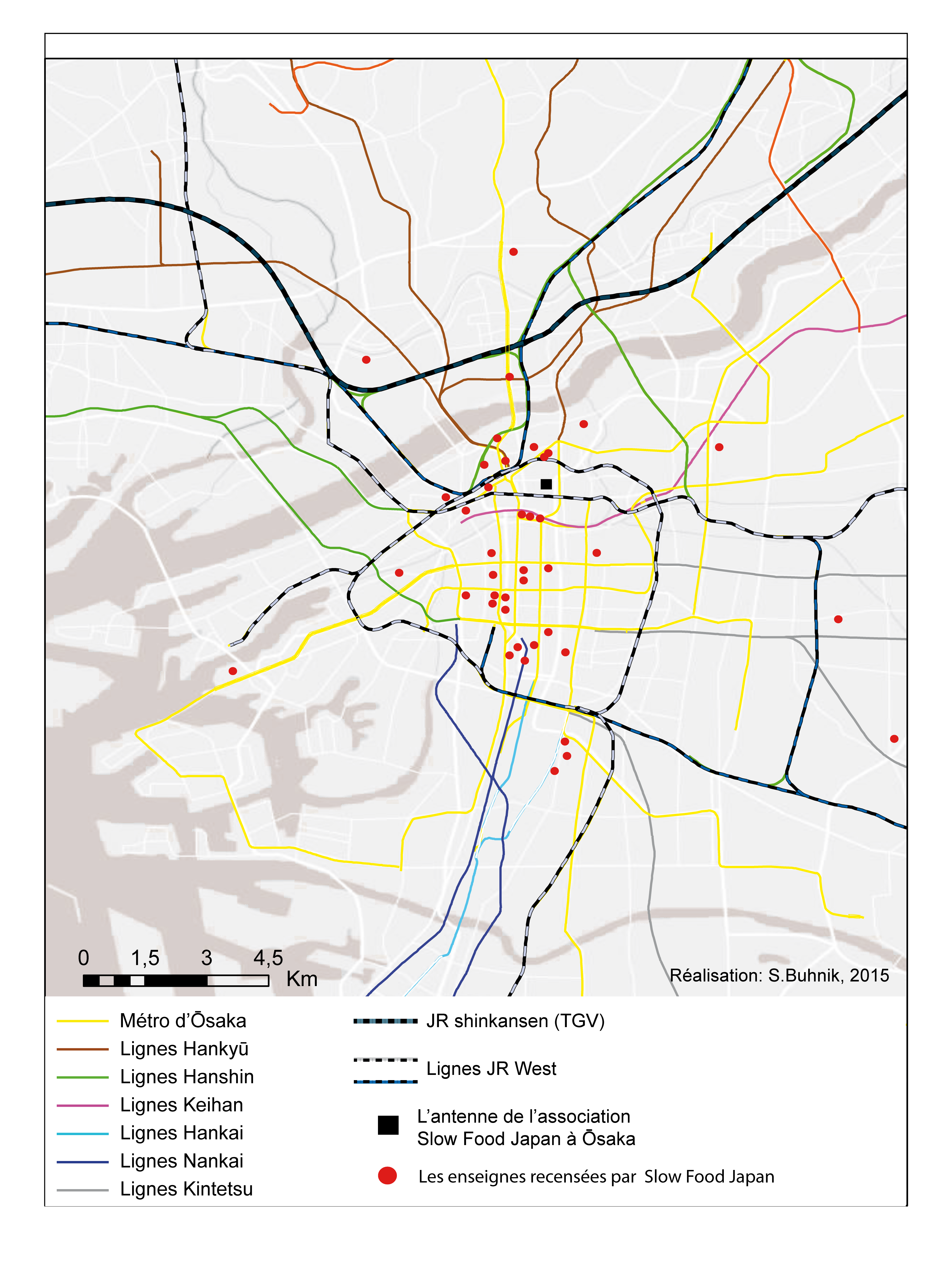 Figure 3. L’emplacement des enseignes de vente ou de consommation de nourriture biologique recensés par l’association food Japan à Ōsaka