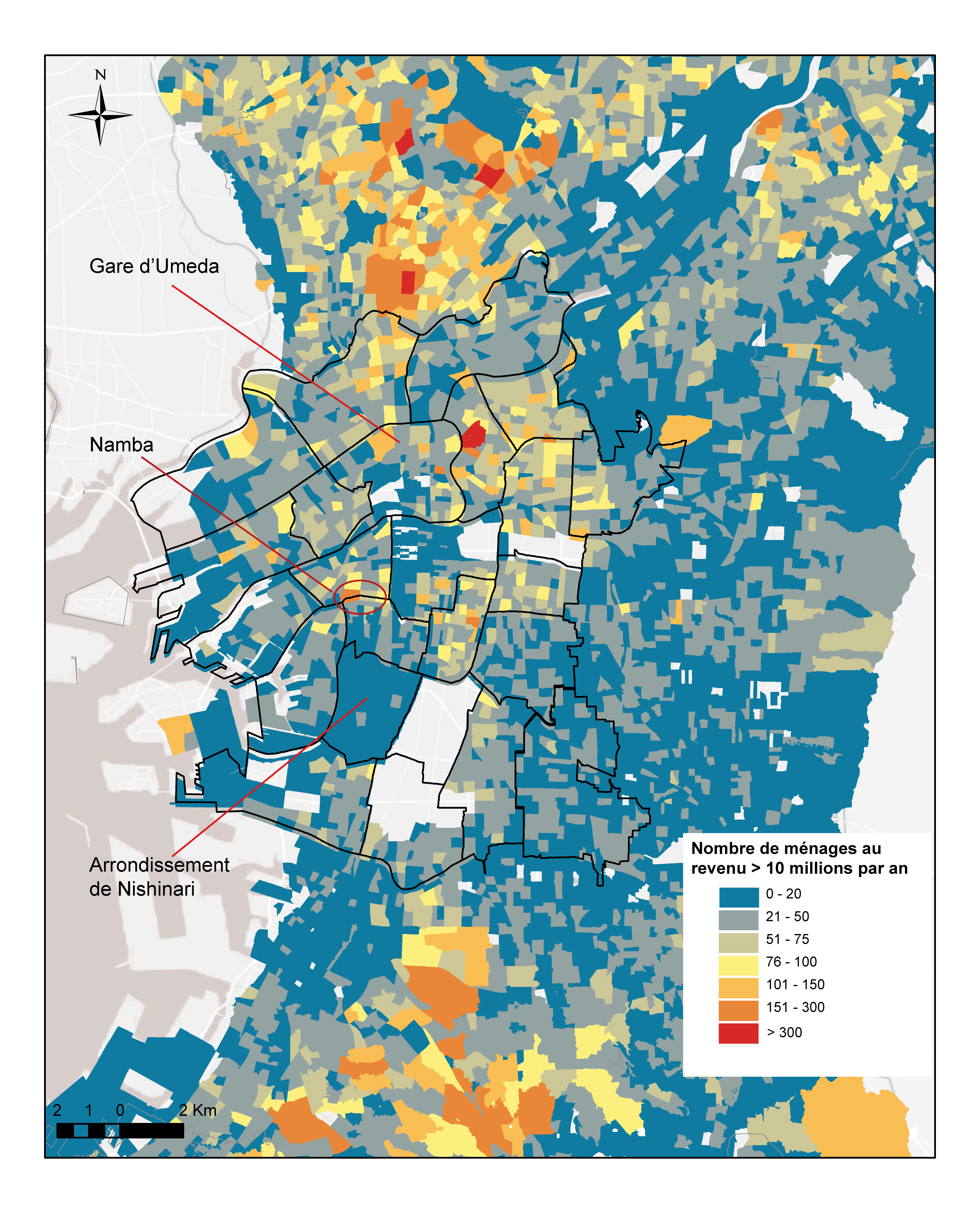 Figure 4. Le nombre de ménages au revenu annuel supérieur à 10 millions de yen (73 000 euros environ) par quartier à Ōsaka. . En 2013, le revenu annuel médian au Japon s’élève à 4,32 millions de yen (31 000 euros environ).