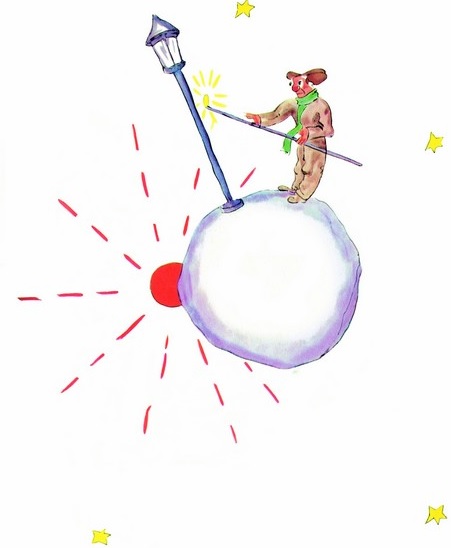 Comme elles ne savent pas voir ce qui est important, les grandes personnes sont aussi tristes. Elles se distraient de cette tristesse en comptant, ou bien elles tombent dans des cercles vicieux, « s’agitent et tournent en rond », comme le buveur (chapitre XII) sur sa planète, qui boit pour oublier sa honte de boire, comme les voyageurs de la planète du chapitre XXII qui voyagent sans savoir où ils vont, seulement parce que « on est jamais content là où l’on est ». Ils ne savent pas ce qu’ils cherchent : « seuls les enfants savent ce qu’ils cherchent ». Le Petit Prince lui-même a bien failli tomber dans le piège : il est parti de sa planète sans bien savoir ce qu’il cherchait, il est parti pour fuir parce qu’il avait « des difficultés avec une rose ». Or partir, bouger, ne sert à rien qu’à faire regretter d’être parti. Le paradoxe est que si le mouvement est bien un déracinement il est aussi la condition pour connaître la valeur de l’enracinement, de l’attachement au lieu que l’on quitte. En d’autres termes, ce que les « grandes personnes » ont perdu est leur capacité à faire lieu, et leur mouvement devient quête du lieu, quête qui elle même pousse au mouvement qui lui-même empêche de faire lieu. C’est ce que le Petit Prince va comprendre, accédant alors à une nouvelle compréhension de son monde. C’est le renard (chapitre XXI) qui, sur la terre (qui est la septième planète visitée), va lui faire don de la clé : « on ne voit bien qu’avec le cœur. L’essentiel est invisible pour les yeux ». Mais pour bien voir il faut prendre le temps, et même le perdre : le temps d’apprivoiser, le temps d’aimer. Sur trois planètes visitées au moins le Petit Prince rencontre des personnages obsédés par le temps. Le businessman le lui dit clairement : « je n’ai pas le temps de flâner ». Le marchand de pilule (chapitre XXIII) quant à lui vent des pilules qui coupent la soif et font gagner le temps que l’on passe à boire (« on épargne cinquante-trois minutes par semaine » précise le marchand, « les experts ont fait des calculs »). L’allumeur de réverbère est au contraire une victime d’un temps qui s’accélère. Sa planète (chapitre XIV) est la plus petite de celles visitées par le Petit Prince, l’allumeur y vit seul et son rôle est d’allumer le réverbère au coucher du soleil et de l’éteindre à son lever. Comme sa planète tourne de plus en plus vite, il doit allumer et éteindre de plus en plus souvent, presque jusqu’au clignotement :