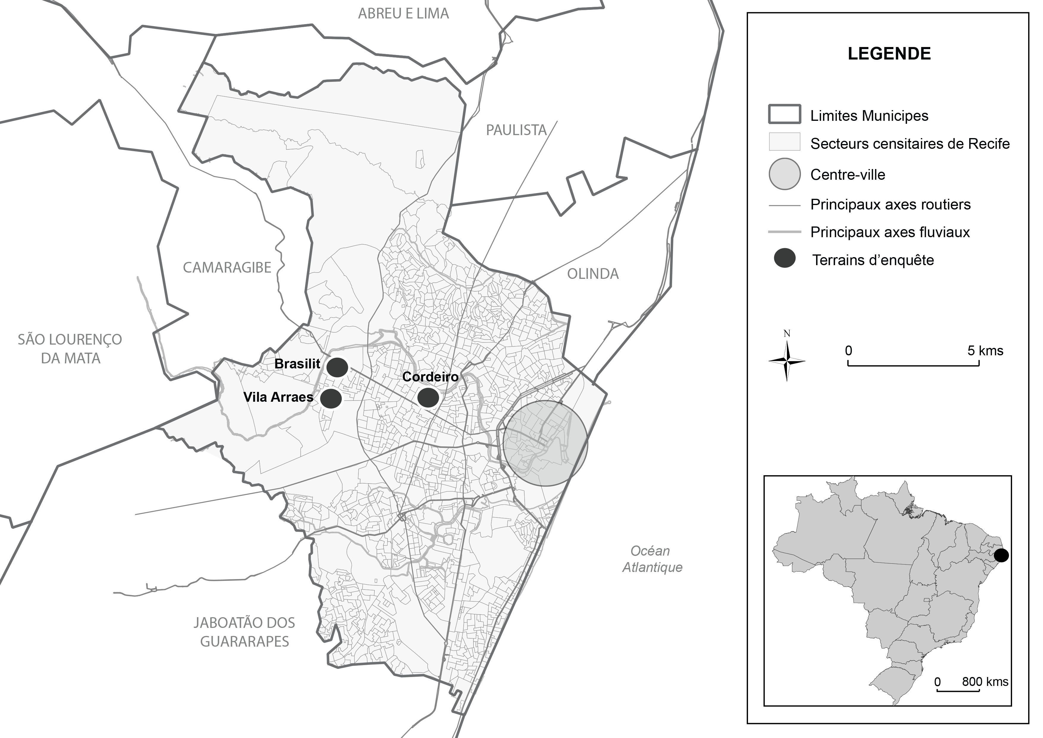 Trois zones pauvres de la ville de Recife ont fait l’objet de ce travail : Brasilit, Villa Arraes et Cordeiro (Figure 1). Les deux terrains d’enquête situés à l’extrémité ouest de la ville (Brasilit et Vila Arraes), dans le quartier Varzea, sont des zones informelles auto-construites classées « aglomerados subnormais », faisant partie des zones les plus défavorisées de la ville. La troisième zone d’étude est un ensemble de logements sociaux appelé « Conjunto Habitacional Cordeiro » (CHC), également située dans un quartier ouest de la ville (Cordeiro). Ce dernier accueille environ 700 familles issues d’anciennes zones pauvres du centre qui ont été éradiquées suite à un programme de relogement public. L’intérêt de ces zones d’enquêtes réside dans leur localisation péricentrale qui bénéficie d’une bonne desserte des transports collectifs et d’une présence importante de commerces et services à usage quotidien. Les habitants qui y résident sont donc moins éloignés des aménités du centre-ville, contrairement aux ménages modestes des périphéries qui éprouvent des difficultés d’accès aux mobilités et aux différentes ressources, comme l’ont observé de nombreuses études, au Nord comme au Sud (Fol, 2010, Jouffe et al., 2015).