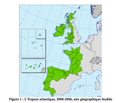 Au final, notre choix a tenu compte de la formulation de l’Espace atlantique dans sa version 2000-2006. Des raisons pragmatiques l’ont arrêté : une période coïncidant avec celle du travail de thèse, la continuité géographique proposée, de l’Ecosse à l’Andalousie, qui évite l’élimination de régions littorales, et, l’intégration de régions non littorales voisines, maintenant les liens évidents de proximité interterritoriale qu’il semblait inopportun d’ignorer.