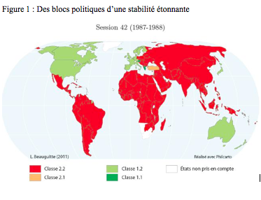 Les traitements statistiques sur les résolutions soumises au vote permettent de mettre en évidence une régionalisation politique dynamique du Système-Monde. Si le monde a beaucoup changé en vingt-cinq ans, les grands ensembles politico-spatiaux demeurent d’une grande stabilité et opposent grosso modo l’Occident (incluant le Japon puis, pour la dernière décennie, la Corée du Sud) et le reste du monde (voir figure 1). Si l’Assemblée générale peut être considérée comme un reflet relativement fidèle des évolutions du Système-Monde, et l’étude lexicale des résolutions adoptées lors de la période considérée le montre, les comportements des acteurs au sein du système onusien sont marqués par une rigidité freinant les évolutions.