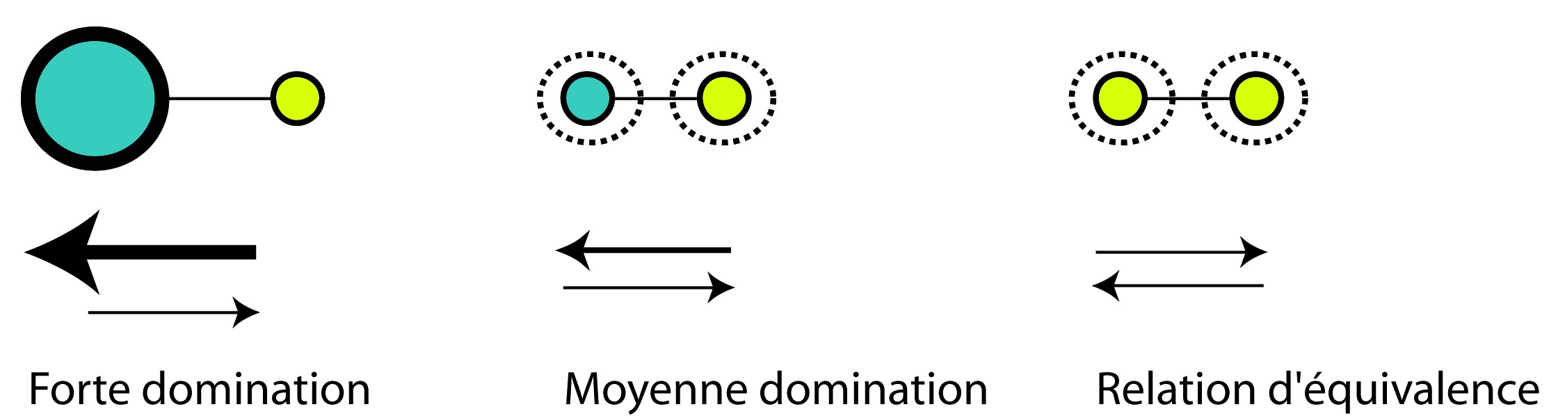 Les centres urbains du sud du Chili à l'intérieur de chaque région entretiennent trois types de relations (voir figure 2). Le premier type, que nous avons nommé de forte domination, possède une dominance par sa taille et par la présence d'aspects fonctionnels. En effet, il s'agit de deux centres urbains où l'un d'entre eux est de plus grande taille que l'autre. La dominance du centre de plus grande taille est liée aux aspects économiques et administratifs, la concentration de biens et de services, d'infrastructure, d'éducation et d’emploi sont des caractéristiques de cette domination. La proximité ne serait pas déterminante dans cette configuration, car le centre dominant de grande taille pourrait gérer un rayon de domination presque à échelle régionale sur un autre centre urbain. Des exemples en sont la ville de Temuco et sa dominance sur les centres urbains de Nueva Imperial ou Lautaro, mais c'est aussi le cas de Puerto Montt et son effet sur la ville de Llanquihue, ou, sur des distances géographiques plus éloignées, l'influence de la ville de Temuco sur Victoria.