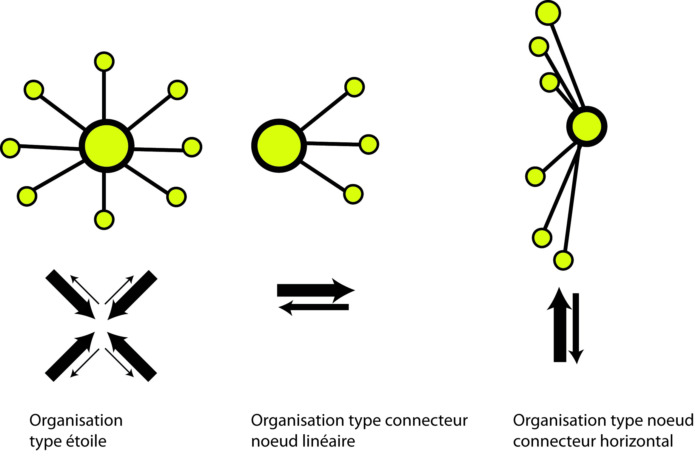 À l’échelle régionale, nous pouvons constater trois types de configurations (voir figure 3), la première organisation est de type étoile, elle est constituée de plusieurs villes dominées par un grand centre urbain. Il s'agit d'un réseau monocentrique à forte relation hiérarchique verticale. Les flux se dirigent plutôt vers le centre et dans ce cas l'attraction est liée à l'emploi, l'éducation, à l’infrastructure et aux services. Par la disposition géographique des villes dans l'espace nous pourrions dire que cette organisation est présente dans la région de La AraucanÃa.