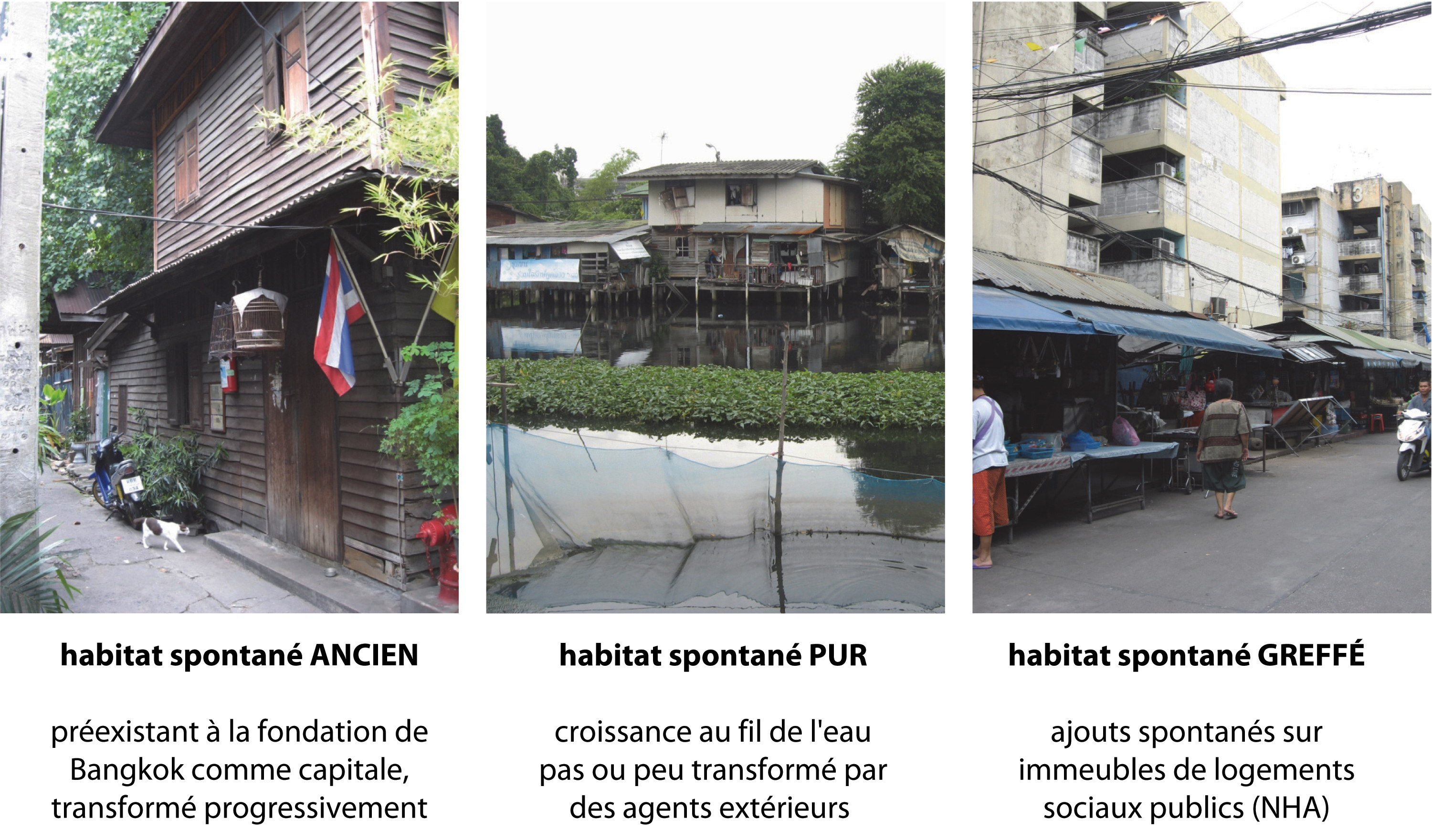 La croissance des bidonvilles interroge les modalités de production de la ville, notamment dans les pays en développement. Ce phénomène global demeure majoritairement prégnant dans les métropoles des pays émergents et en développement, où il pose des problèmes sanitaires, environnementaux et urbains notamment (Davis, 2006). C'est ainsi un défi majeur de développement qui illustre les inégalités et une certaine non-maîtrise de la croissance urbaine. À Bangkok, outre la flexibilité de leur architecture, de tels ensembles cristallisent souvent des pratiques sociales et une histoire commune propres au lieu. Bien que rarement pris en compte dans la métropole et victimes d'une image négative, ils font preuve d'un dynamisme économique et associatif stimulant et représentent un enjeu fort face aux notions de développement durable et de droit à la ville, à l'échelle locale comme internationale. Généralement qualifiés de « communautés denses » ou « slum communities », nous avons privilégié ici le terme « habitat spontané » parce que directement lié à la question spatiale et au processus constructif qui le caractérise.