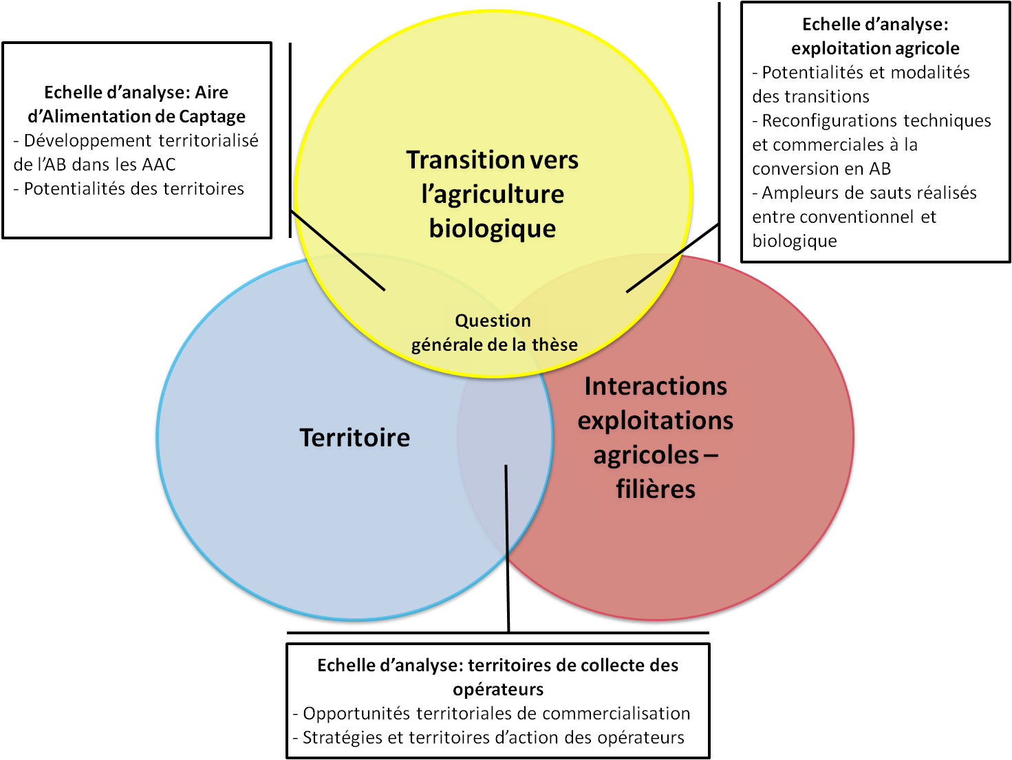 Des injonctions environnementales récentes ont été émises dans le domaine de la qualité de l’eau : la Directive-Cadre européenne sur l’Eau imposant l’atteinte d’un bon état écologique et chimique des masses d’eau en 2015 et le Grenelle Environnement qui a conduit à l’identification de 507 captages particulièrement menacés et désignés aujourd’hui comme « captages Grenelle ». Des changements de pratiques agricoles sont attendus pour limiter les pollutions diffuses d’origine agricole. L’agriculture biologique, mode de production se distinguant de l’agriculture dite « conventionnelle » notamment par l’interdiction des intrants chimiques de synthèse, est une des solutions globales permettant d’atteindre ces objectifs et sa diffusion dans les zones à enjeu eau est souhaitée par les agences de l’eau notamment. La question de la mise en œuvre des changements de pratiques agricoles dans les territoires et plus particulièrement dans les aires d’alimentation de captages (AAC) est ainsi posée. L’objectif de ma thèse a été d’étudier les transitions des exploitations agricoles vers l’AB dans les territoires, en prenant comme cas d’étude les aires d’alimentation de captages en Île-de-France. En m’inscrivant dans la discipline de l’agronomie des territoires (Papy, 2001) , j’ai développé une interface disciplinaire avec la géographie pour analyser ces transitions sous l’angle des interactions entre les systèmes techniques et de commercialisation à différentes échelles territoriales. J’ai adopté une approche systémique en mobilisant différents champs théoriques et en interrogeant les articulations du système (figure 1). J’ai cherché à répondre à la question suivante : quelles interactions entre les systèmes techniques et de commercialisation dans les exploitations agricoles et quels effets sur leurs transitions vers l’AB dans les territoires particuliers que sont les aires d’alimentation de captages ?