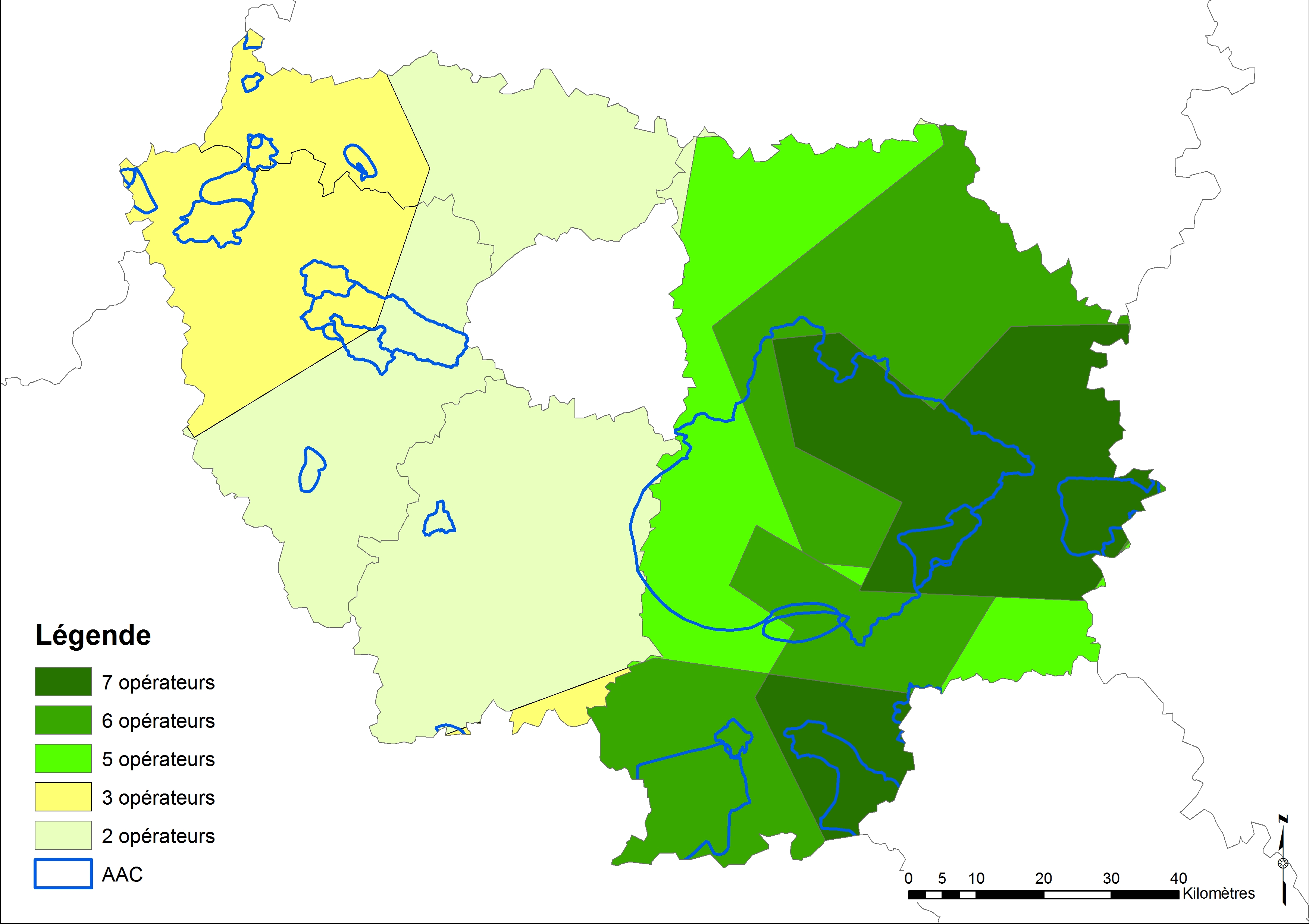 Figure 2 : Schématisation du degré de superposition des bassins de collecte des opérateurs en grandes cultures (coopératives et négociants) et croisement avec les AAC en Île-de-France