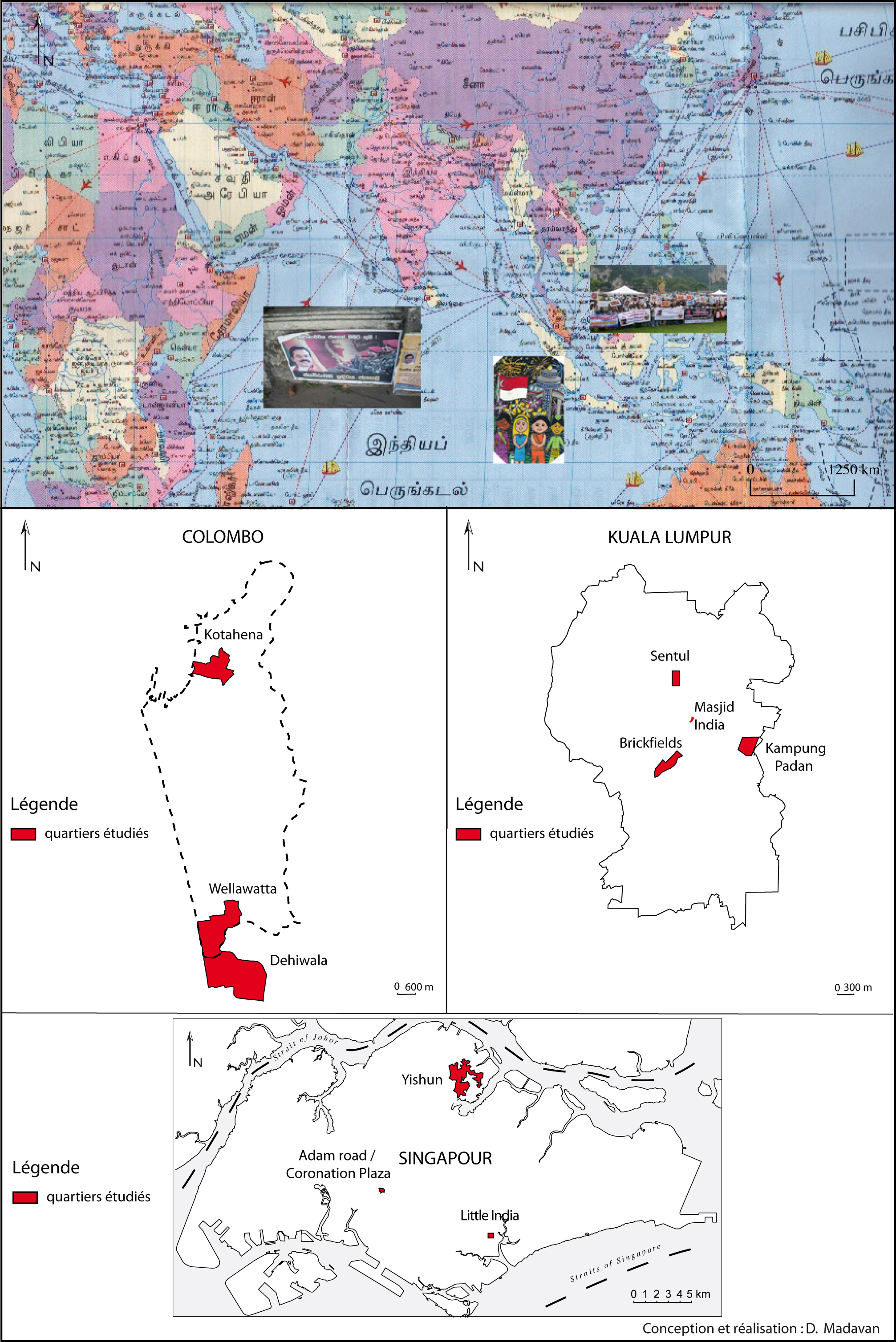 Figure 2.Les terrains étudiés à Colombo, Kuala Lumpur et Singapour