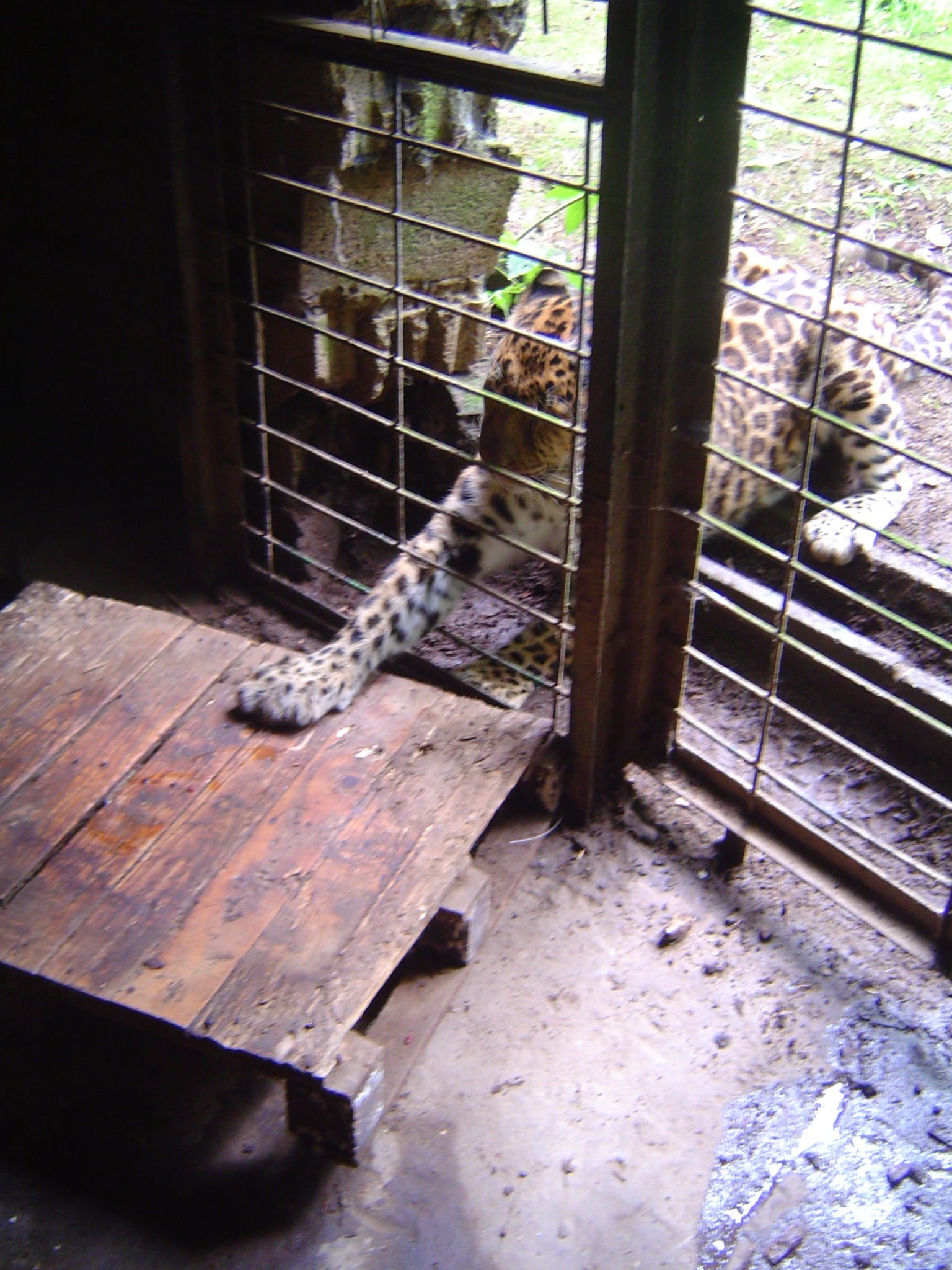 Nous entendant arriver, la panthĂšre vient immĂ©diatement sâinstaller devant la trappe par laquelle elle pourra entrer quelques instants plus tard. Elle rugit en nous regardant, puis passe une patte Ă lâintĂ©rieur du rĂ©duit, agrippe la palette en bois qui lui sert de couchage, la soulĂšve et la fracasse contre la grille.