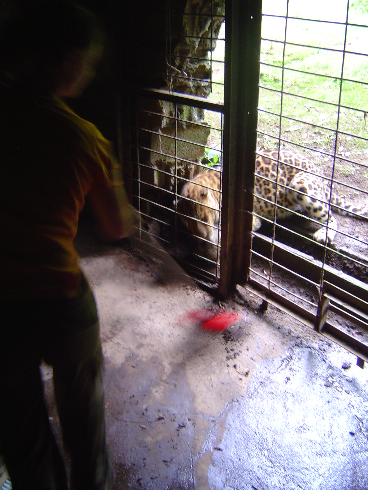Nous abordons le secteur des fĂ©lins par lâenclos dâune panthĂšre, que je nâavais guĂšre remarquĂ©e les jours passĂ©s, tant elle se tenait en retrait, dans un renfoncement de son habitat. Il faut se rendre dans le rĂ©duit Ă lâarriĂšre de la cage, lĂ oĂč la panthĂšre passe la nuit et prend son repas. Il est nettoyĂ© quotidiennement, avant quâon y dĂ©pose des quartiers de viande. Le public nây accĂšde jamais et nâen soupçonne pas mĂȘme lâexistence, puisquâil est masquĂ© par la dĂ©clivitĂ© du terrain.