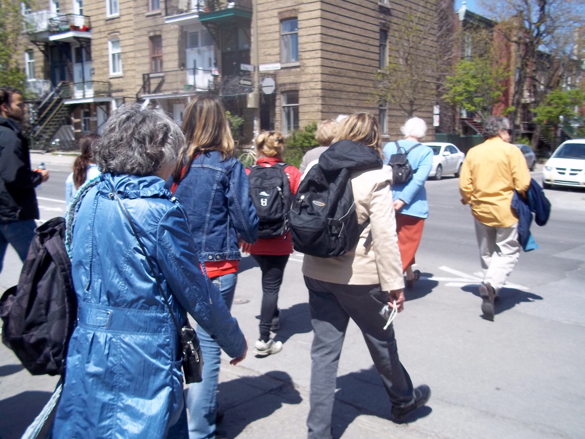 J’ai ainsi participé à plusieurs de ces marches pour m’approprier la rue, comprendre son organisation territoriale, délimiter les quartiers et partager sa connaissance avec les acteurs. Moments de découverte mais aussi de contacts susceptibles de déboucher sur des entretiens, ces marches se sont révélées des sources d’informations majeures, objectives et historiques, mais aussi sur le rapport au territoire des citadins montréalais, des guides aux participants ; bref, elles m’ont permis d’acquérir une connaissance de l’espace que j’étudiais, une culture locale commune. Les guides de ces marches, véritables médiateurs urbains, se proposent de faire découvrir un quartier ou de partager leurs connaissances (informations historiques, anecdotes mais aussi leur propre vécu) selon leurs compétences et envies. Ces guides forment un groupe assez hétérogène (Wynn, 2006), tantôt guides officiels, détenteurs d’un certificat de compétence de guide touristique délivré par l’Institut du tourisme et d’hôtellerie du Québec, tantôt animateurs spécialisés, tantôt citadins passionnés par leur ville.