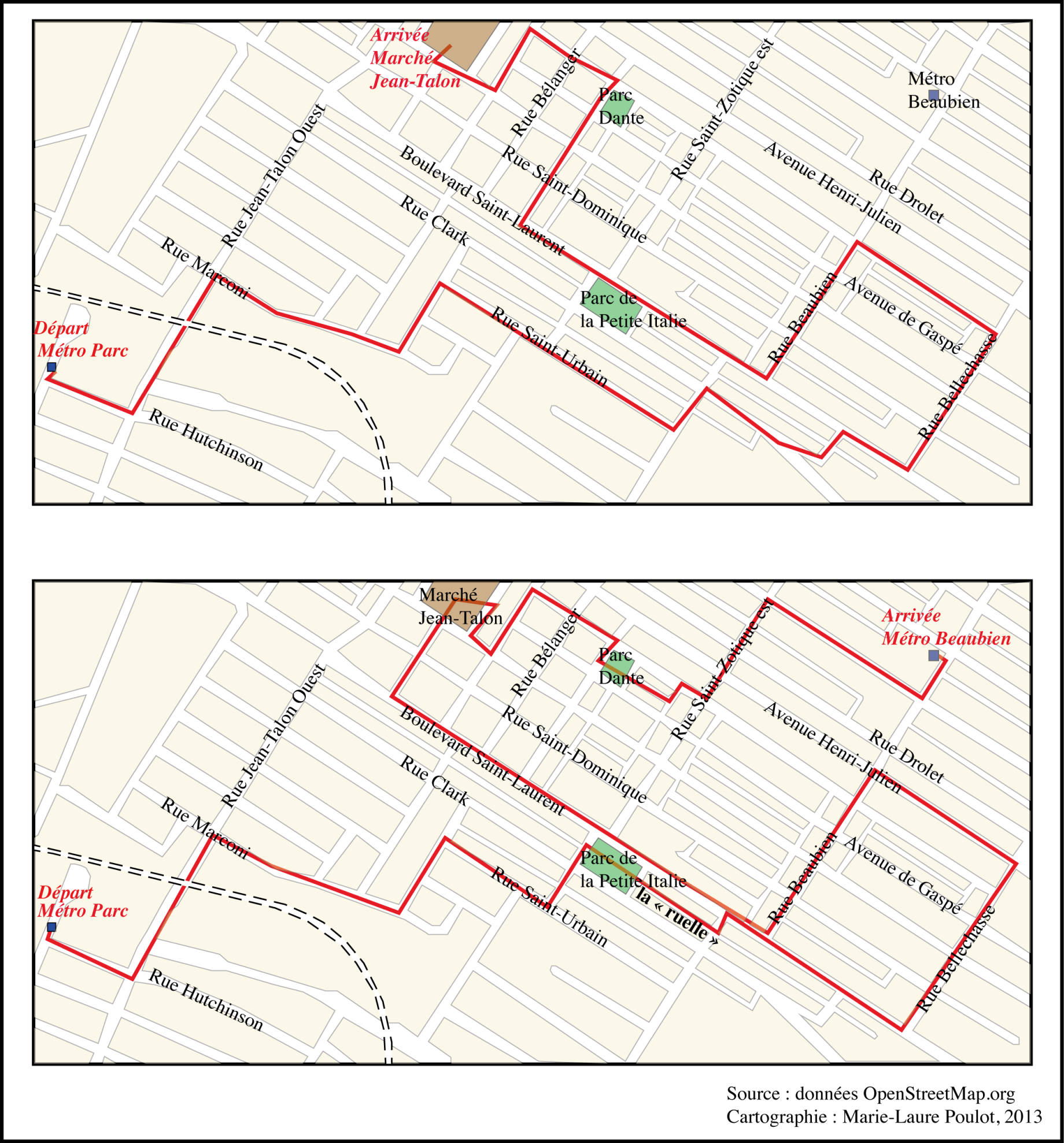 Assez vite, marcher sur le boulevard m’a aidée à délimiter mon terrain du Nord au Sud selon mes problématiques de recherche (figure 2). En observant les pratiques et les rythmes d’activité, j’ai ainsi éliminé le tronçon entre la rue Jean-Talon et la Transcanadienne, à double sens, qui répondait à d’autres logiques et dynamiques que la partie au sud, à sens unique. Il ne porte plus les marques de l’installation des communautés culturelles, de l’autre ce n’est plus l’artère vivante très fréquentée par les piétons du fait d’une offre commerciale limitée : le parc Jarry est présent sur le côté ouest, tandis que le côté est comporte davantage d’espaces résidentiels et de bureaux. Cependant la marche seule ne permet pas de délimiter le terrain, elle est confortée par les entretiens, formels et informels, avec des citadins : la plupart des enquêtés placent ce tronçon hors du « véritable » boulevard, défini a contrario comme un « espace qui se marche ». Inversement, alors que marcher la rue entre le Vieux-Port et le boulevard René-Lévesque me portait à mettre de côté cette portion, les entretiens m’en ont dissuadé : si la plupart des personnes interrogées la dénigraient, voire ne l’évoquaient pas dans leurs descriptions des lieux appréciés ou utilisés, elles ont aussi souligné le poids historique de ce secteur, son lien avec le Vieux-Port, porte d’entrée des immigrants avant leur installation sur le boulevard. Lectures bibliographiques et entretiens avec des historiens et des professionnels en patrimoine ont confirmé cette approche habitante, même si l’ouverture du boulevard sur le fleuve ne date que du début du XXe siècle (1911-1914). J’ai donc pris en compte cette section, pour son rôle historique, autant que pour ses transformations et sa faible appropriation par les citadins.