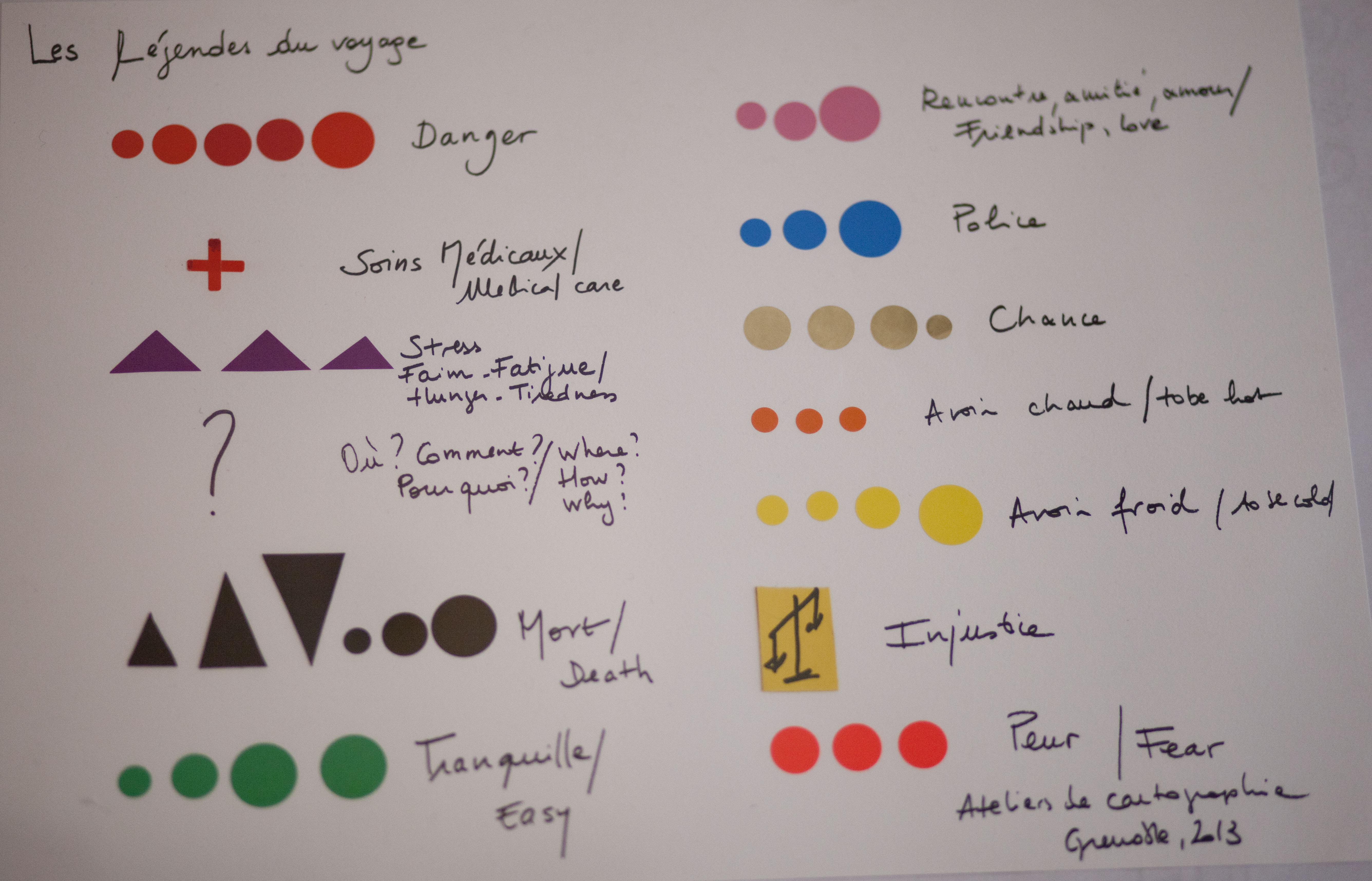 Les modalités de participation ont varié selon les quatre propositions pratiques mises en œuvre. Dans le travail proposé par Sarah Mekdjian par exemple, il s'agissait de créer une légende, décidée collectivement à partir de discussions sur les expériences des voyages. Cette légende, matérialisée par des gommettes, a été élaborée dans les premiers temps de l'atelier. La formalisation d'un langage commun a été une étape essentielle pour mettre en perspective collective la singularité de chaque récit individuel. La légende a constitué une condition pour que le geste cartographique serve à faire affleurer des souvenirs et à communiquer des bribes d'expériences vécues. Les relations entre chercheurs et voyageurs, artistes et voyageurs, artistes et chercheurs se sont construites et renforcées pendant la réalisation des cartes.