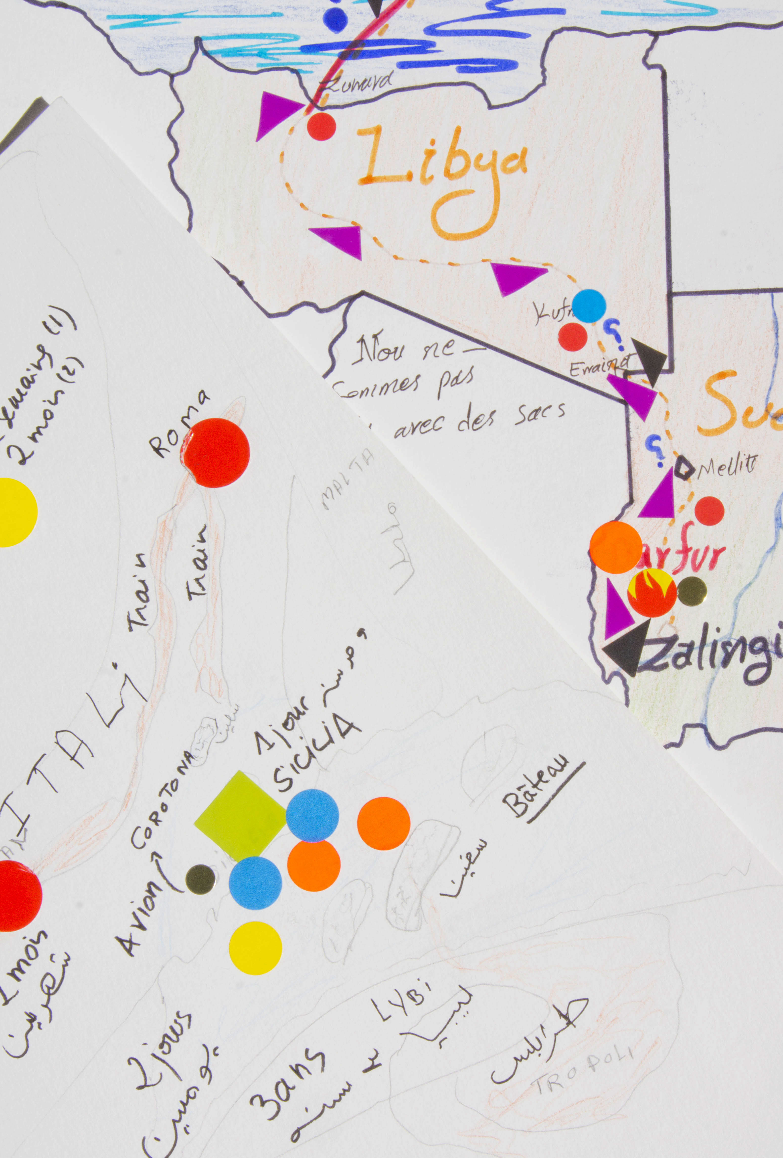 Comme les ateliers de cartographie, ce texte est polyphonique et expérimental. A défaut de théorisation définitive, nous proposons d'ouvrir en acte un espace d'échanges à plusieurs voix sur cette expérience en cours. Plutôt que de parler au nom des migrants, des artistes ou des chercheurs engagés dans ce projet, plusieurs participant.e.s ont saisi l'opportunité de s'exprimer en leur propre nom. Les échanges entre les participant.e.s ne sont pas rapportés sous forme de citations. Pendant les ateliers, les voyageurs n'ont pas été interviewés par les chercheurs ni écoutés à partir d'une méthodologie de recueil de récit de vie. Chaque participant s'est exprimé dans le cadre d'un travail cartographique proposé par les chercheurs et les artistes et discuté en commun.