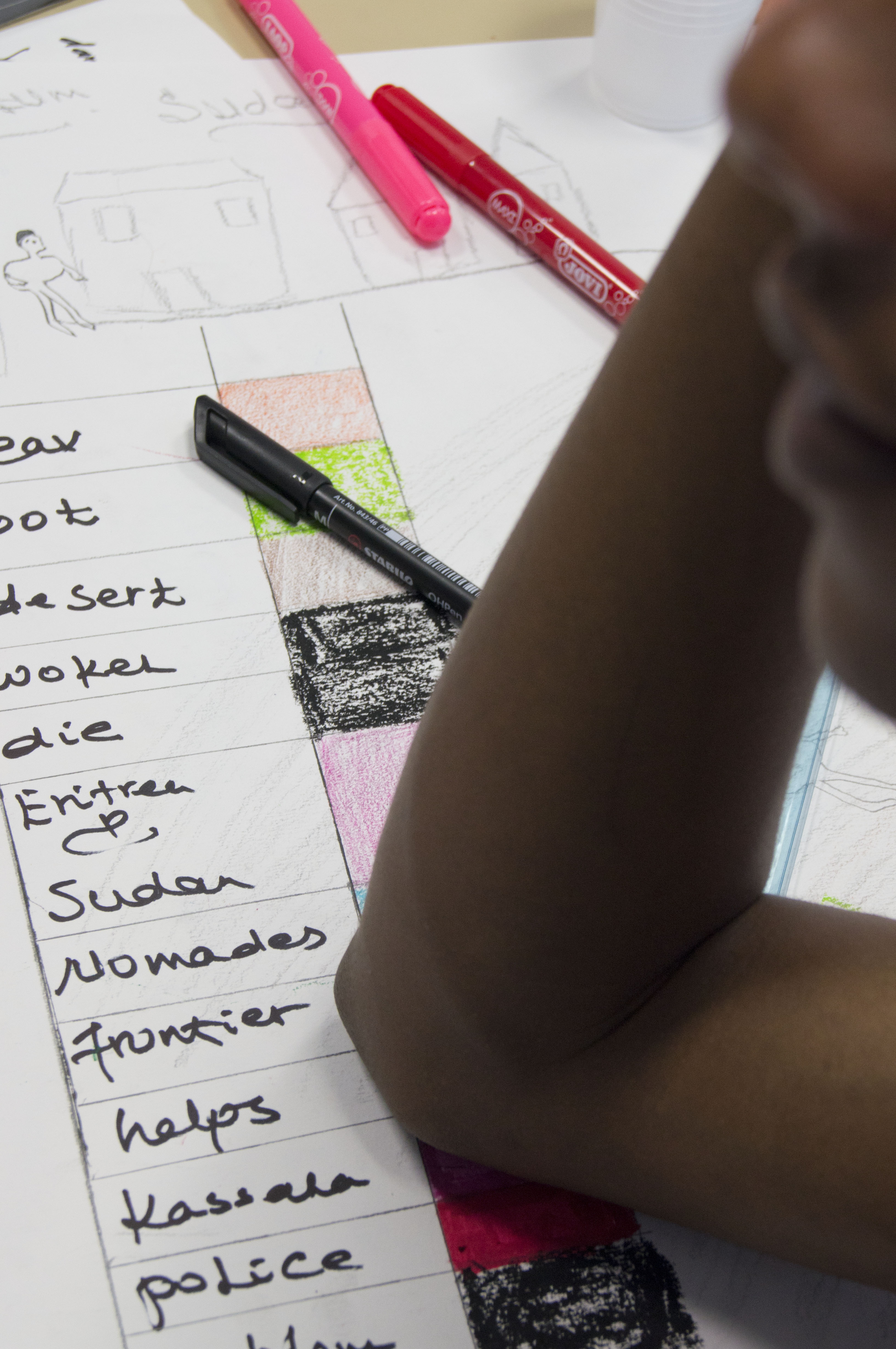 Ainsi, l'expérience des ateliers a engagé une réflexion sur plusieurs registres d'entre-deux : l'entre- deux du voyage et des espaces de transit vécu et raconté par les participants ; la cartographie, comme outil de médiation, entre-deux méthodologique, mis au service des relations tissées entre les participants. La figure de l'entre-deux sert ainsi à la fois à désigner notre objet de recherche et notre méthode : l'espace-temps des voyages migratoires, et le défi méthodologique qui a consisté à créer un cadre d'échanges entre des individus caractérisés par plusieurs écarts, linguistiques, discursifs, sociaux, administratifs.