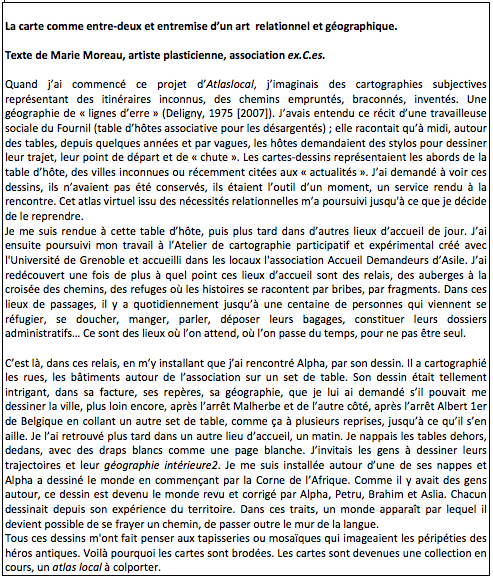 2-Marie Moreau a demandé aux voyageurs de dessiner individuellement leurs voyages sur de grandes nappes blanches, qu'elle a ensuite brodées en partie. Ce dispositif est proche de la cartographie mentale. L’œuvre réalisée intitulée « Atlaslocal » (2013) est composée des cartes dessinées et brodées avec les participants des ateliers de cartographie et d'autres personnes rencontrées dans des centres sociaux grenoblois.