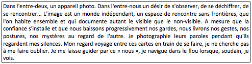 La réalisation de ces cartes, visuelles et sonores, a permis en partie de subvertir l'injonction administrative de produire des récits chronologiques et linéaires particulièrement normatifs, contraignants et assujettissants (Fassin, Kobelinsky, 2012). Nous souhaitions éviter de reconduire ces conditions normatives dans des interviews ou des entretiens, à partir desquels nous aurions