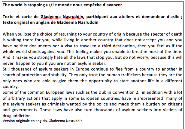 Il est ressorti toutefois que si les participants avaient surtout travaillé pour eux-mêmes, dans une dynamique très cathartique, ils étaient particulièrement demandeurs que les cartes produites circulent, de façon à pouvoir montrer leur travail et s'en servir pour engager des relations avec le public. Le texte écrit par Gladeema Nasruddin, présenté ci-après, est adressé directement aux lecteurs de cet article : il exprime un discours politique sur les situations sociales et politiques vécues par les demandeurs d'asile. Le texte vient aussi en accompagnement des photographies d'une des cartes que Gladeema Nasruddin a réalisée pendant les ateliers, intitulée « The world is stopping us/Le monde nous empêche d'avancer » (figures 7 et 8). La situation exprimée à travers la carte est aussi au fondement de l'engagement de Gladeema Nasruddin au sein des ateliers.