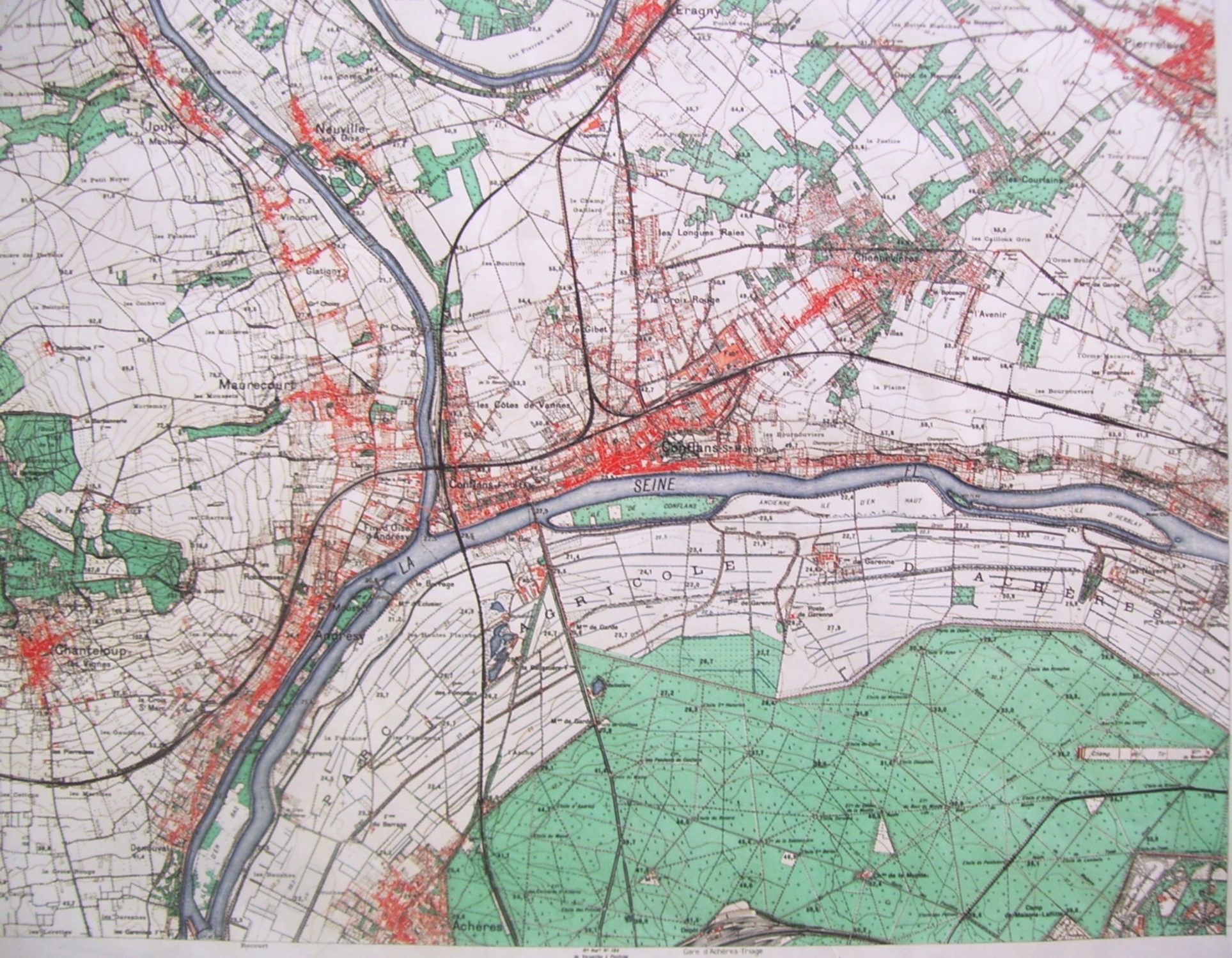 De son côté, la commune, avec sa station de RER « Achères-ville » – le nom joue ici un rôle essentiel – qui relie Cergy-Pontoise à Paris en passant par la Défense, tient à développer un nouveau quartier d’habitation comprenant équipements culturels et éducatifs nécessaires à son bon fonctionnement et au développement d’une nouvelle identité, plus urbaine et plus attractive. La conséquence de cette pluralité des enjeux est la fragmentation de la plaine qui, peu à peu, perd son intégrité physique, et peut-être sa cohérence territoriale, comme en témoigne les deux cartes ci-dessous (figures 10 et 11) qui montrent bien à quel point l’entité qu’elle formait dans les années 1930 a été fragmentée par ses aménagements successifs et constants.